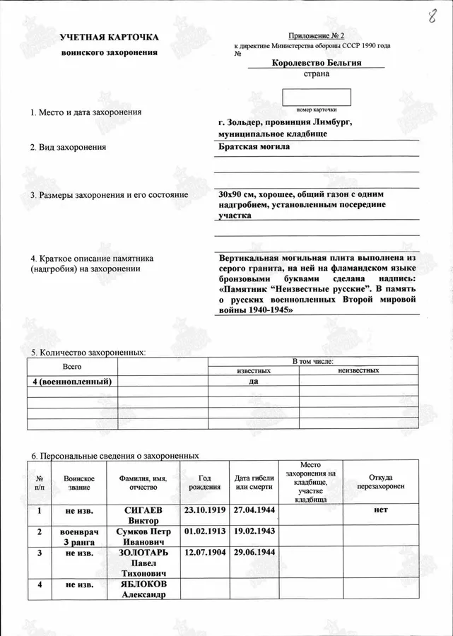 Поименный список захоронения Дата рождения 01.02.1913 Дата выбытия 19.02.1943 Воинское звание военврач 3 ранга Страна захоронения Бельгия Место захоронения Зольдер Захоронение 86401969