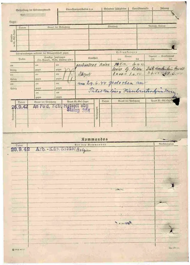 Документ о военнопленных Дата рождения 01.02.1913 Место рождения г. Чкалов, Касмолино Дата выбытия __.02.1943 Причина выбытия погиб в плену Место захоронения Бельгия, Хезден Биография погиб в плену Источник информации ЦАМО Фонд ист. информации 58 Опись ист. информации 977532 Дело ист. информации 1