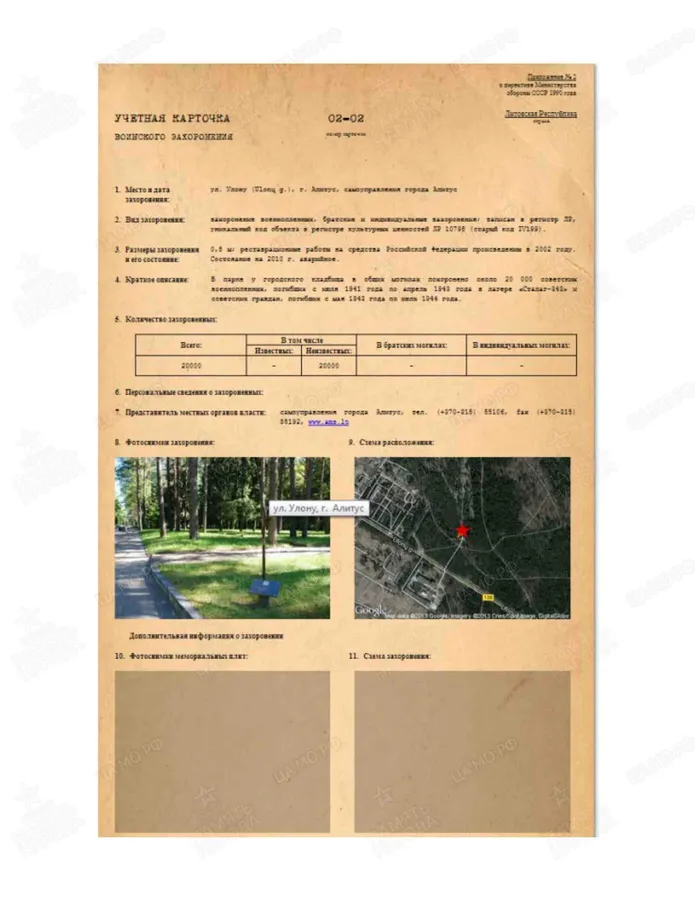 Информация о захоронении Страна захоронения Литовская Республика Регион захоронения Алитусский р-н Номер захоронения в ВМЦ З370-02-02 Первичное место захоронения г. Алитус, ул. Улону, городское кладбище, около, парк Вид захоронения братские захоронения, индивидуальные захоронения Состояние захоронения аварийное Захоронено всего 20000 Захоронено известных 0 Захоронено неизвестных 20000 Кто шефствует над захоронением Самоуправление г. Алитус https://www.obd-memorial.ru/html/info.htm?id=1151250637