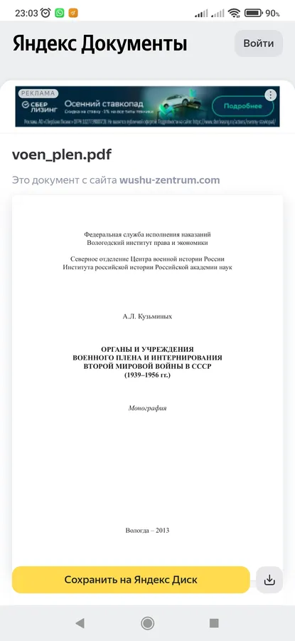 | Кузьминых, Александр Леонидович. Органы и учреждения военного плена и интернирования Второй мировой войны в СССР (1939-1956 гг.) [Текст] : монография / А. Л. Кузьминых ; Федеральная служба исполнения наказаний, Вологодский ин-т права и экономики, Северное отд-ние Центра военной истории России Ин-та российской истории Российской акад. наук. - Вологда : ВИПЭ ФСИН России, 2013. - 179 с. : табл.; 21 см.; ISBN 978-5-94991-233-1