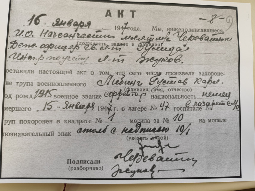 «Я докладываю, что, согласно указанию отъезд немцев с 13 октября этого года был остановлен. Последняя партия немцев в размере 820 человек (567 на репатриацию в Германскую Демократическую Республику и 253 в Федеративную Республику Германии), будет представителям правительства Германской Демократической Республики переданы 19 октября, а Федеративной Республики Германии 20 октябре этого года. В настоящее время на территории Советского Союза находится в общей сложности 3840 немцев, в том числе 2536 для репатриации в Федеративную Республику. Из них 1200 немцев находились в пути – в 2-х эшелонах по 600 человек, которые сейчас в районе города Мoжайска и в районе железнодорожной станции Потьма Мордовской АССР находятся.