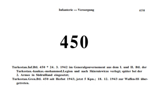 Turkestan.Inf.Btl. 450 * 24. 3. 1942 im Generalgouvernement aus dem I. und II. Btl. der Turkestan.-kaukas.-mohammed.Legion und nach Skierniewicze verlegt; später bei der 2. Armee in Südrußland eingesetzt; Turkestan.Gren.Btl. 450 seit Herbst 1943, jetzt 5 Kpn.; 18. 12. 1943 zur Waffen-SS übergetreten.