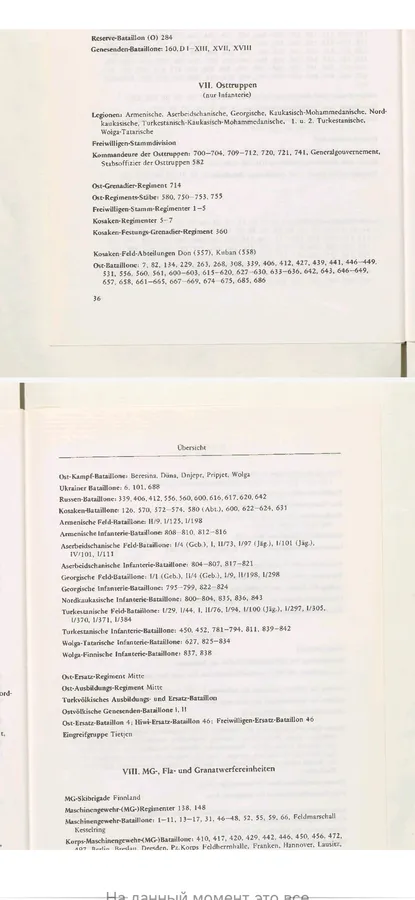 Ost-Bataillon 308 Ost-Bataillon 268 Ost-Ausbildungs-Bataillon 619 Ost-Bataillon I./447 Ost-Bataillon II./447 Ost-Ausbildungs-Bataillon (Heeresgruppe Sud) Ost-Bataillon 620 Ost-Bataillon 646 Ost-Bataillon 617 Ost-Bataillon 412 Ost-Bataillon 229 Ost-Artillerie-Abteilung 621 Ost-Reiter-Abteilung II./454 Ost-Reiter-Abteilung III./454 Kuban-Kosaken Abteilung I./5 1., 2. Ost-Kompanie/137 1. - 3. Ost-Kompanie/446 Ost-Kompanie 156 Ost-Kompanie 383 Ost-Kompanie 253 1. Ost-Kompanie/229 1., 2. Ost-Kompanie/131 1., 2. Ost-Kompanie/267 Ost-Kompanie 260 Ost-Kompanie 455 Ost-Kompanie 456 Ost-Kompanie 626 Ost-Kompanie z.b.V. 2 1., 2. Ost-Reiter-Schwadron/447 Ost-Reiter-Schwadron 286 Ost-Reiter-Schwadron 221 Ost-Reiter-Schwadron 580 Kosaken Kavallerie-Schwadron 655 Kosaken Artillerie-Batterie 553 2. Ost-Artillerie-Batterie/Ausbildungs-Regiment Mitte 1. Ost-Artillerie-Batterie/203 Ost-Kompanie 152 Ost-Kompanie 337 Ost-Kompanie 331 Ost-Ersatz-Bataillon 4 Wirtschaft [Единственная рота, помеченная как батальон] 1. Ost-Kompanie/427 Ost-Lager Priluki Truppenubungsplatz Wildflecken Armenisches Infanterie-Bataillon 814 Armenisches Infanterie-Bataillon I./125 Turkestanisches Infanterie-Bataillon I./76 Turkestanisches Infanterie-Bataillon 789 Turkestanisches Infanterie-Bataillon 889 [Расформирован 28 ноября 1943] 1., 2. Nordkaukasische Infanterie-Kompanie/844 [28 ноября 1943, послуживший основой для формирования Nordkaukasisches Infanterie-Bataillon 843 ] Nordkaukasisches Infanterie-Bataillon 842 Turkestanische Infanterie-Kompanie (bei LVI. Panzerkorps) Turkestanische Infanterie-Kompanie (bei 2. Armee) Turkestanische Infanterie-Kompanie (bei 16. Armee) Oberbefehlshaber West Stab-Kommando der Ostlegion (DIVISION) Wolgatatarische Legion (REGIMENT) Armenische Legion (REGIMENT) Aserbeidschanische Legion (REGIMENT) Turkestanische Legion (REGIMENT) Nordkaukasische Legion (REGIMENT) Georgische Legion (REGIMENT) Stellvertretendes Generalkommando XIII. Armeekorps (Wehrkreis XIII) 4. Aserbeidschanische Nachschub-Kompanie/573 (Amberg/Oberpfalz) Befehlshaber der deutschen Truppen im Danemark Ost-Bataillon 603 Ost-Bataillon 653 Ost-Bataillon 662 Ost-Bataillon 667 Ost-Bataillon 674 (Weicker) 20. Gebirgsarmee Ost-Kompanie 690 Wehrmachtbefehlshaber Niederlande LXXXVIII. Armeekorps Turkestanisches Infanterie-Bataillon 787 Armenisches Infanterie-Bataillon 812 15. Armee Ost-Bataillon 618 Nordkaukasisches Infanterie-Bataillon 835 Turkestanisches Infanterie-Bataillon 781 Armenisches Infanterie-Bataillon 813 Armenisches Infanterie-Bataillon 809 7. Armee Ost-Bataillon 439 Ost-Bataillon 627 [8 декабря 1943 переименован в Wolgatatarisches Infanterie-Bataillon 627] Ost-Bataillon 643 Ost-Bataillon 642 Ost-Bataillon 600 Ost-Bataillon 635 Ost-Bataillon 669 Ost-Reiter-Abteilung 281 Georgisches Infanterie-Bataillon 795 Georgisches Infanterie-Bataillon 823 Nordkaukasisches Infanterie-Bataillon 800 Wolgatatarisches Infanterie-Bataillon 827 Georgisches Infanterie-Bataillon 797 Georgisches Infanterie-Bataillon 798 Ost-Reiter-Abteilung 285 (4 Kompanien) 1. Armee Kosaken Regiments-Stab z.b.V. 750 Kosaken Bataillon 622 Kosaken Bataillon 623 Kosaken Bataillon 624 Kosaken Bataillon 625 Kosaken Kompanie 638 Nordkaukasisches Infanterie-Bataillon 803 Georgisches Infanterie-Bataillon 822 Wolgatatarisches Infanterie-Bataillon 826 General der Pioniere und Festungen Ost-Batillon 601 [5 ноября 1943 реорганизован как Ost-Bruckenbau-Pionier-Bataillon (tmot). 601 (3 Kompanien) ] Ost-Bataillon 605 [Reorganized as Ost-Bruckenbau-Pionier-Bataillon (tmot.) 605 (3 Kompanien) on 14 December 1943] Militarbefehlshaber Frankreich Ost-Bataillon 615 Georgisches Infanterie-Bataillon 799 In Transit to Oberbefehlshaber West Ost-Bataillon 602 Ost-Bataillon 628 Ost-Bataillon 629 Ost-Bataillon 630 Ost-Bataillon 633 Ost-Bataillon 634 Ost-Regiments-Stab z.b.V. 752 Sanitatszug Ost-Ausbildungs-Regiment Mitte Ost-Bataillon 636 Ost-Bataillon 649 Aserbeidschanisches Infanterie-Bataillon 807 Wolgafinnisches Infanterie-Bataillon 837 Ost-Bataillon 680 Heeresgruppe B Bevollmachtigt General der deutschen Wehrmacht Ost-Bataillon 339 Ost-Bataillon 555 Ost-Bataillon Kranz Generalkommando Witthoft Ost-Bataillon 556 LI. Gebirgskorps Ost-Bataillon 620 II. SS-Panzerkorps 162. Infanterie-Division (turk.) Ost-Btl. 263 Ost-Bataillon 412 Ost-Bataillon 616 Ost-Bataillon 617 Georgisches Infanterie-Bataillon II./198 Heeresgruppe F 2. Panzerarmee LXIX. Reserve-Korps 1. Kosaken Division Heeresgruppe E 1. Ost-leichte-Nachschub-Kolonne/54 2. Ost-leichte-Nachschub-Kolonne/54