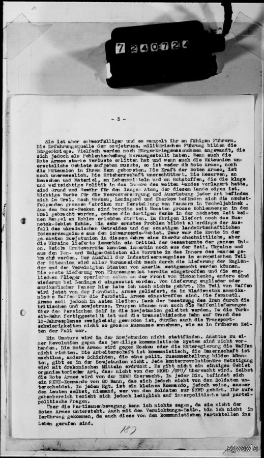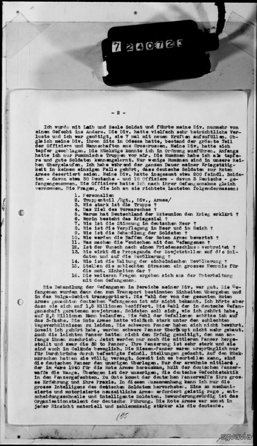 Обращение с пленными в районе моего подразделения было хорошим. Затем пленные были переданы подразделениям, предназначенным для перевозки, и отправлены в район Поволжья. "Список пленных, взятых в плен всей Красной Армией, мне неизвестен. Но, я услышал , что она оценивается в 1,5 млн. Число советских людей, попавших в немецкий плен. Солдат, как я слышал, должно быть 2,5 миллиона человек. Число погибших я оцениваю в 3 раза. Красная Армия сильно страдала от плохих дорожных условий. Тяжелые танки не оправдали себя. Насколько я слышал , тяжелые танки больше не строятся. Даже легкие танки не показали успеха. В настоящее время производятся только средние танки. Их броня очень прочная, и они подвижны даже на местности. Танки-гиганты изначально предназначались только для прорыва через укрепленные районы противника. На обратных маршах они потерпели полную неудачу. Насколько я могу судить, немецкие танки превосходят наши. Только доказанный средний калибр , выпущенный для Красной Армии в 1940 году, имеет решающее значение для немецких Панцерваффе. Немецкое панцерваффе имеет свои преимущества., В этом контексте я могу только подчеркнуть большой интеллект немецкого солдата. Такая механизированная и моторизованная современная армия требует умственно активных , быстрых в принятии решений и умных солдат. Заслуживает восхищения организаторский талант немецкого руководства. В остальном Красная Армия была сильнее немецкой в материальном и численном отношении во всех отношениях. Источником опыта советского военного руководства является гражданская война. Меры гражданской войны по-прежнему применяются во многих случаях, но они оказались ошибочными. Запасы людей и материалов, продовольствия и сырья, которые мудрое и прозорливое руководство переместило в глубь обширной страны являются причиной и залогом передышке и победы. Основные заводы по добыче и оборудованию любого типа расположены на Урале. После Москвы, Ленинграда и Харькова следующие крупные заводы по производству танков расположены в Челябинске . В течение нескольких месяцев из Донецкого месторождения добывалось большое количество угля и отправлялось в тыл.. Таким образом, заводы расположенные там, не должны испытывать недостатка в угле в ближайшее время. В остальном же Кузнецкая область по-прежнему поставляет уголь. в настоящее время очень серьезной проблемой является нехватка украинского зерна и другой сельскохозяйственной продукции из Черноземной области. Несмотря на то, что в этом году урожай в Советском Союзе был очень низким, Украина, по крайней мере, собрала треть всего урожая по всему союзу. в конце концов, богатые запасы урожая все еще можно было получить с востока из Донского и Приволжского регионов . Недостаток промышленной продукции в европейской части союза, по всей вероятности, будет компенсирован поставками из Англии и Соединенных Штатов Америки. Первая партия самолетов уже прибыла, и английские летчики уже действовали на фронте , другие, в свою очередь, были развернуты в Ленинграде. От доставки американских танков здесь я еще не слышал. Часть вооружений сейчас доставляется с Дальневосточного направления. Во Владивосток доставляется американское вооружения для дальневосточной армии. Однако часть армия должна оставаться в Азии. Благодаря оккупации Ирана британ