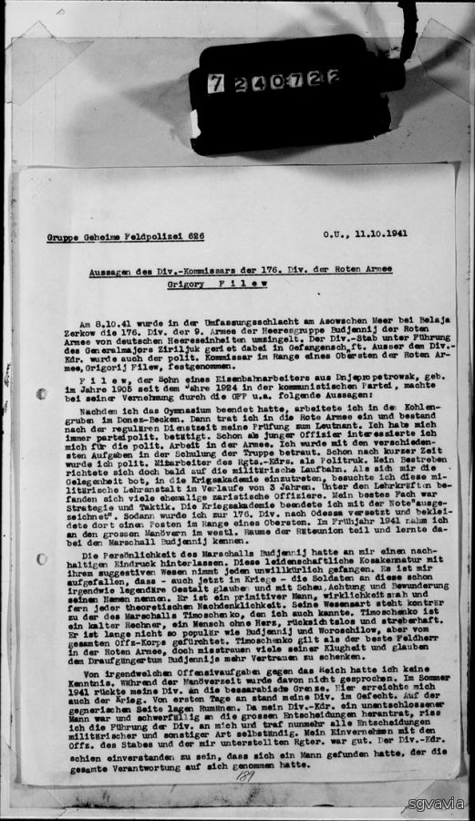 176-я дивизия 9-й армии Красной Армии была окружена немецкими подразделениями . Штаб дивизии во главе с генерал-майором Цирилюком попала в плен. Среди пленных комиссар дивизии (соответствовал воинскому званию полковника Красной Армии) Григорий Филев сын железнодорожного рабочего из Днепропетровска, род. в 1905 г., в Коммунистической партии с 1924 г., На допросе в ГФП дал следующие показания: После окончания гимназии, я работал на угольных шахтах в Донецком бассейне. В 1924 г., я вступил в Коммунистическую партию . Затем я поступил на службу в Красную Армию и сдал экзамен на звание лейтенанта после прохождения срочной службы. Я всегда считал себя партийным политиком. Уже будучи молодым офицером, я заинтересовался политзанятиями. Мне были поручены самые разные задачи по обучению войск. Уже через короткое время я стал политруком. Но вскоре мои устремления были направлены на военную карьеру. Когда мне представилась возможность поступить в Военную академию, я учился в этом политическом учебном заведении в течение 3 лет. Среди преподавателей было много бывших царских офицеров. Моим лучшим предметом была стратегия и тактика. Военную академию я закончил с оценкой "отлично". Затем, я был переведен в 176-ю дивизию в Одессу и занимал там должность полковника. Весной 1941 года я участвовал в крупных маневрах на Западном направлении и познакомился там с маршалом Буденным. Личность маршала Буденного произвела на меня неизгладимое впечатление. Эта страстная казачья натура своим наводящим на размышления характером невольно захватывает каждого. Я заметил, что даже сейчас, на войне, солдаты верят в эту легендарную фигуру и относятся к ней с робостью, уважением и восхищение. Его характер противоположен характеру маршала Тимошенко, которого я тоже знал. Тимошенко - холодный расчетливый, бессердечный, безжалостный и упрямый человек. Он далеко не так популярен, как Буденный и Ворошилов, но его боится весь офицерский корпус. Тимошенко считается лучшим полководцем Красной Армии, но многие не доверяют его уму и считают, что храбрость Буденного заслуживает большего доверия. Летом 1941 года моя дивизия прикрывала границу в Бессарабии. Вот тут-то до меня и дошла война. С первых дней мое подразделение находилось в боевой готовности. На противоположной стороне находилась Румыния. Поскольку мой командир дивизии был нерешительным человеком и с трудом подходил к принятию важных решений, я взял на себя руководство дивизией и теперь самостоятельно принимал все решения военного и иного характера. Я стал солдатом с душой и душой и теперь вел свою дивизию из одного сражения в другое. Дивизия не раз несла очень значительные потери, и я был вынужден 7 раз пополнять ее новыми силами. Хотя штаб моей дивизии находился в Одессе, большая часть офицеров и рядового состава состояла из великороссов. Моя дивизия храбро сражалась. Сначала передо нами были только румынские войска. Румын я знал как храбрых и хороших солдат.. За все время моей военной деятельности я ни разу не слышал, чтобы немецкие солдаты дезертировали в Красную Армию. Подразделениями моей дивизии было захвачено около 200 пленных. Солдаты - из них около 50 немцев - и 10 офицеров ( из них 5 немцев ). Офицеров , я допрашивал сразу после их поимки. Вопросы, которые, я задавал им, были в основном следующими: 1. Персональные данные 2. во