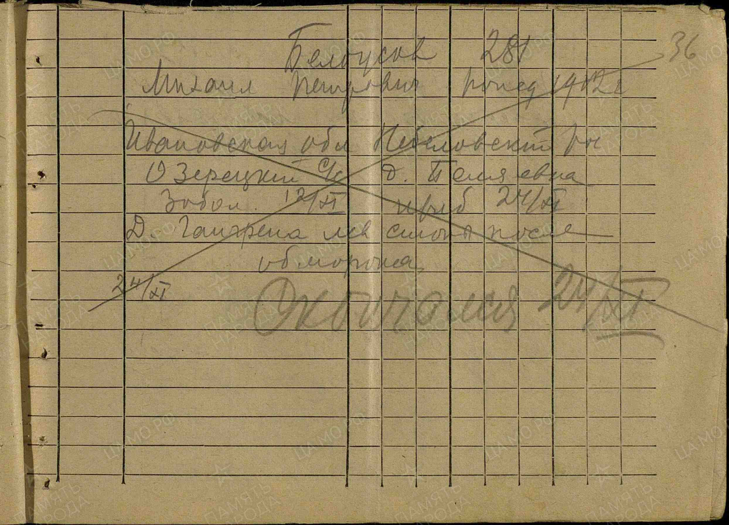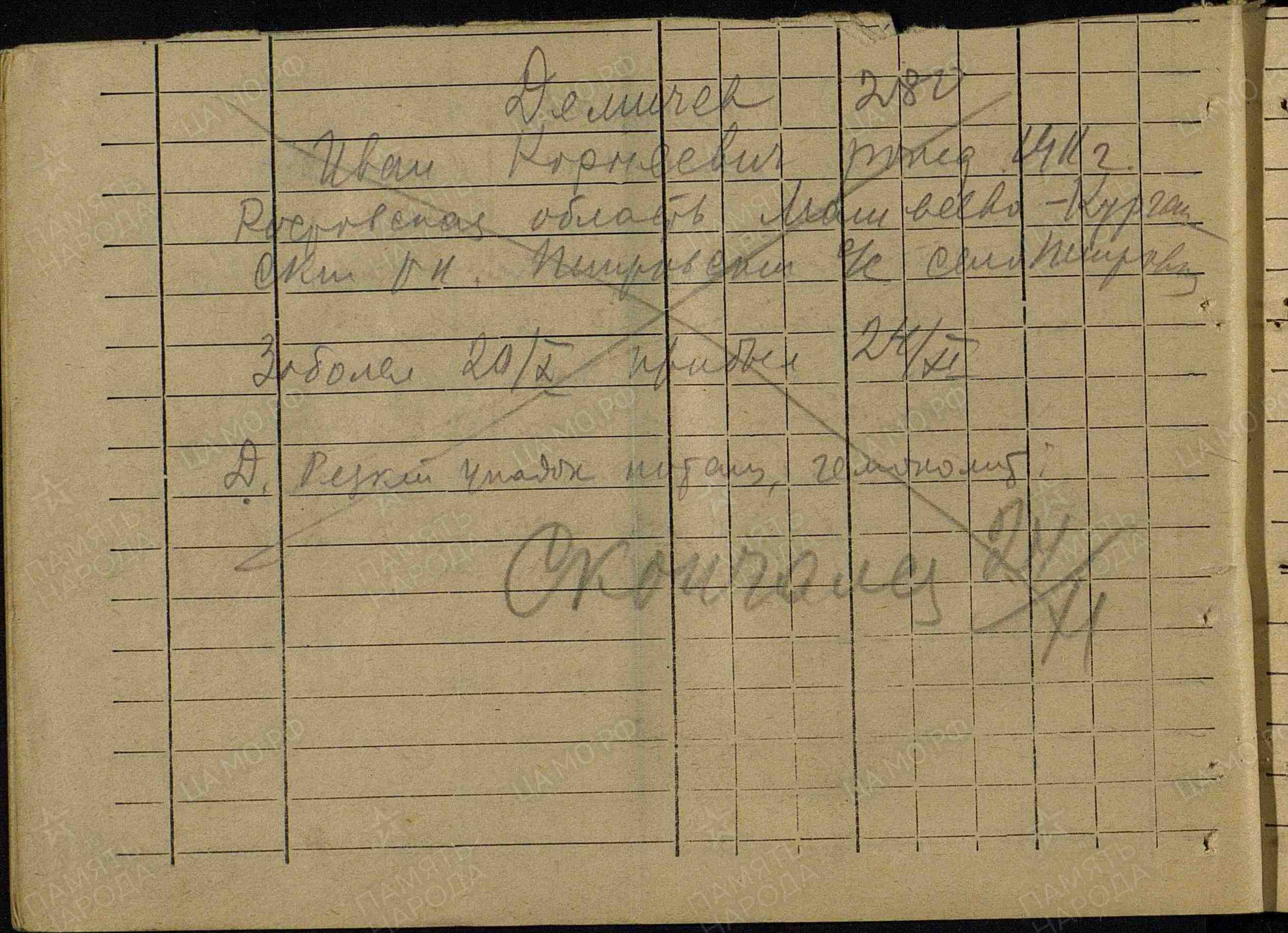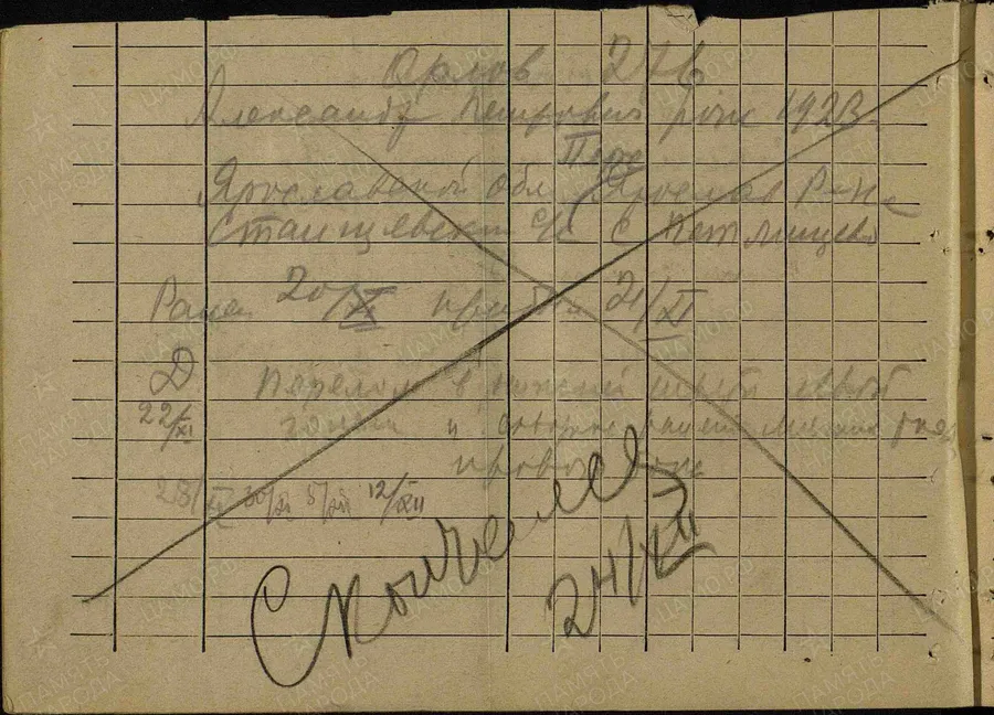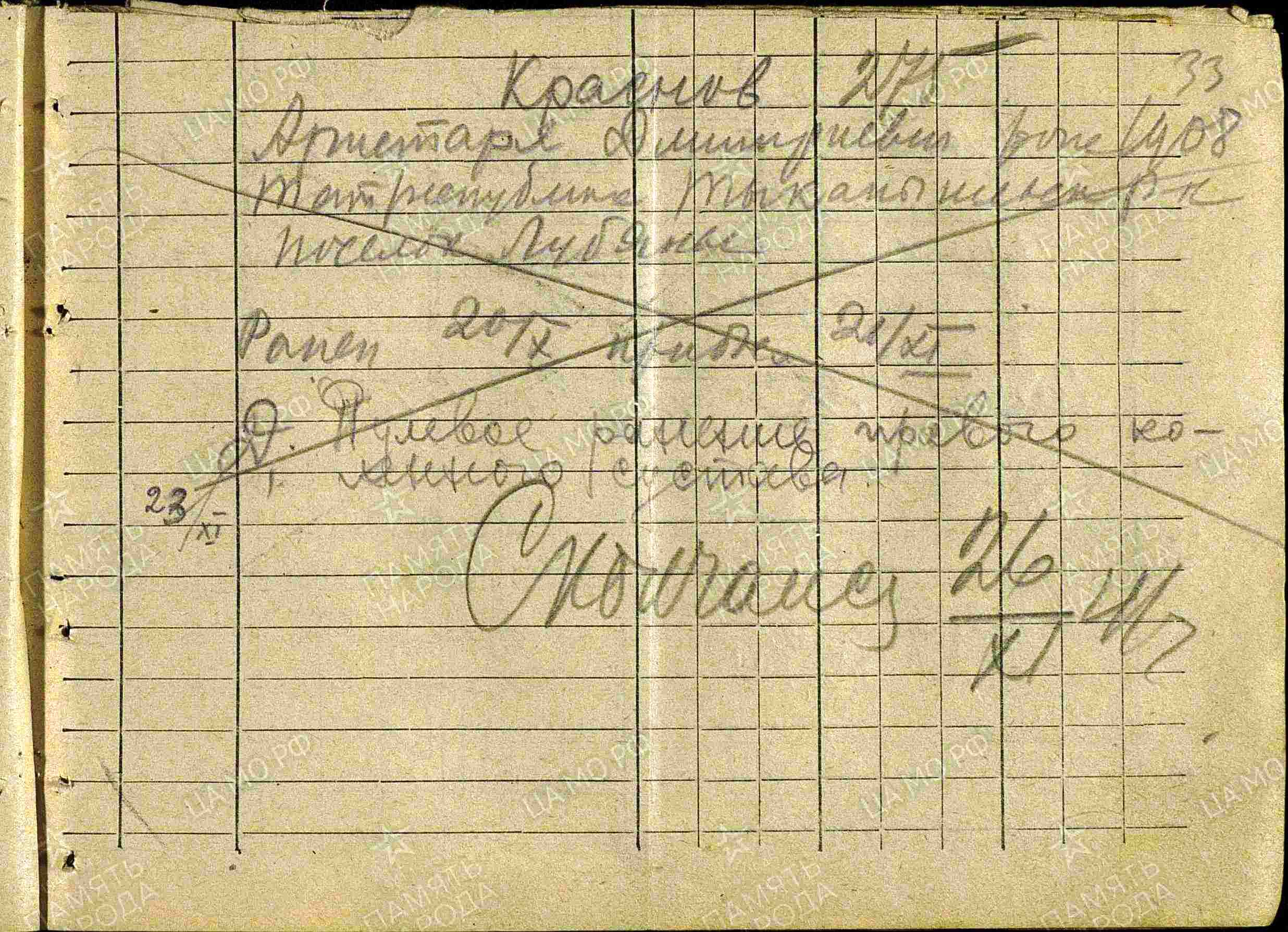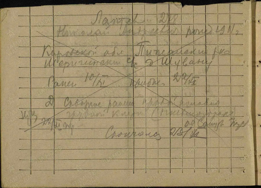 Фамилия Кириллов Имя Николай Отчество Александрович Дата рождения/Возраст __.__.1922 Место рождения Владимирская обл., Владимирский р-н, с. Доброе Дата и место призыва 11.08.1941 Владимирский РВК, Владимирская обл., Владимирский р-н Последнее место службы п/п 488 Воинское звание рядовой Причина выбытия пропал без вести Дата выбытия __.07.1942 Название источника донесения ЦАМО Номер фонда источника информации 58 Номер описи источника информации 977523 Номер дела источника информации 159 https://obd-memorial.ru/html/info.htm?id=72887908 Qui quaerit, reperit