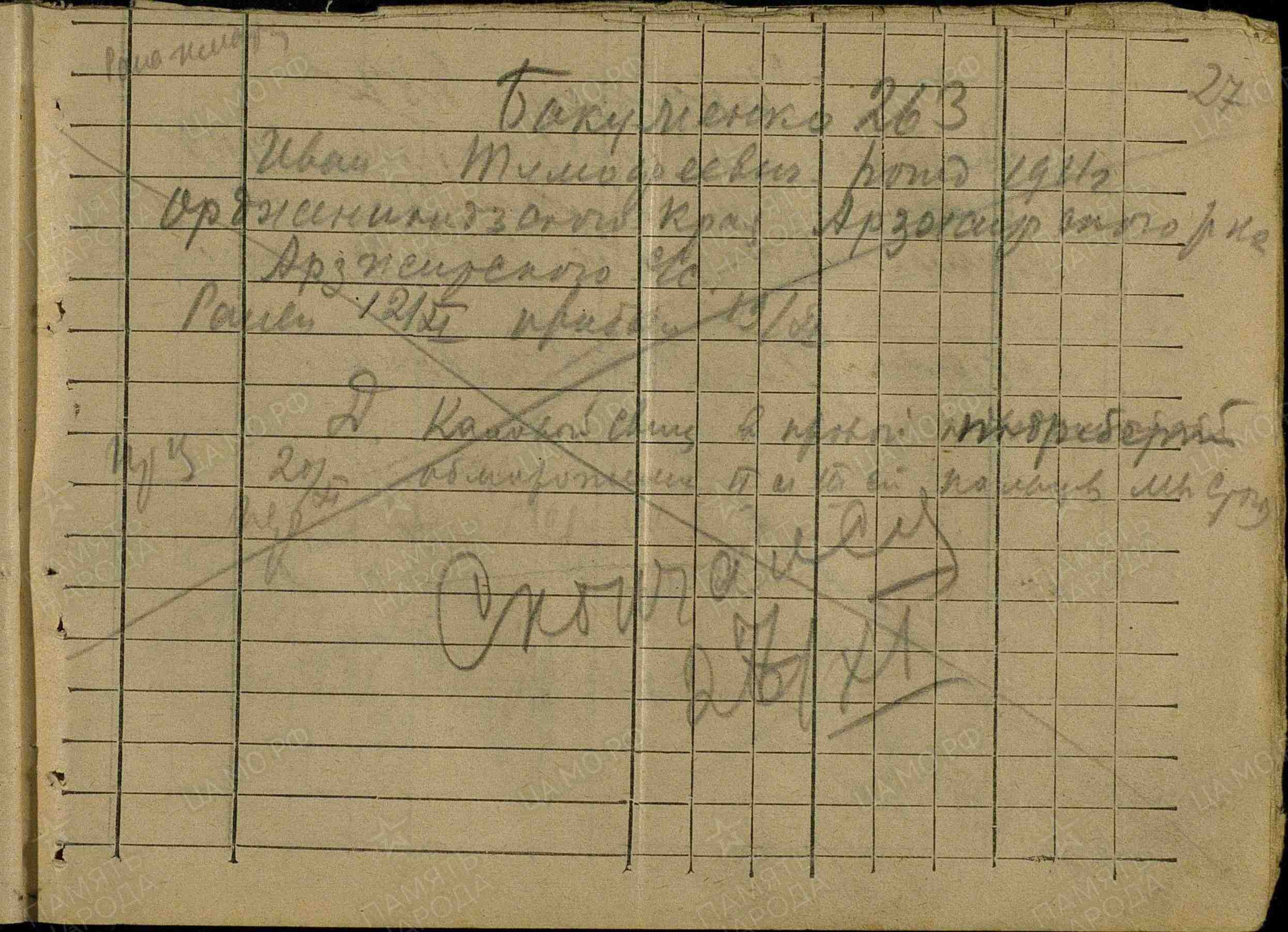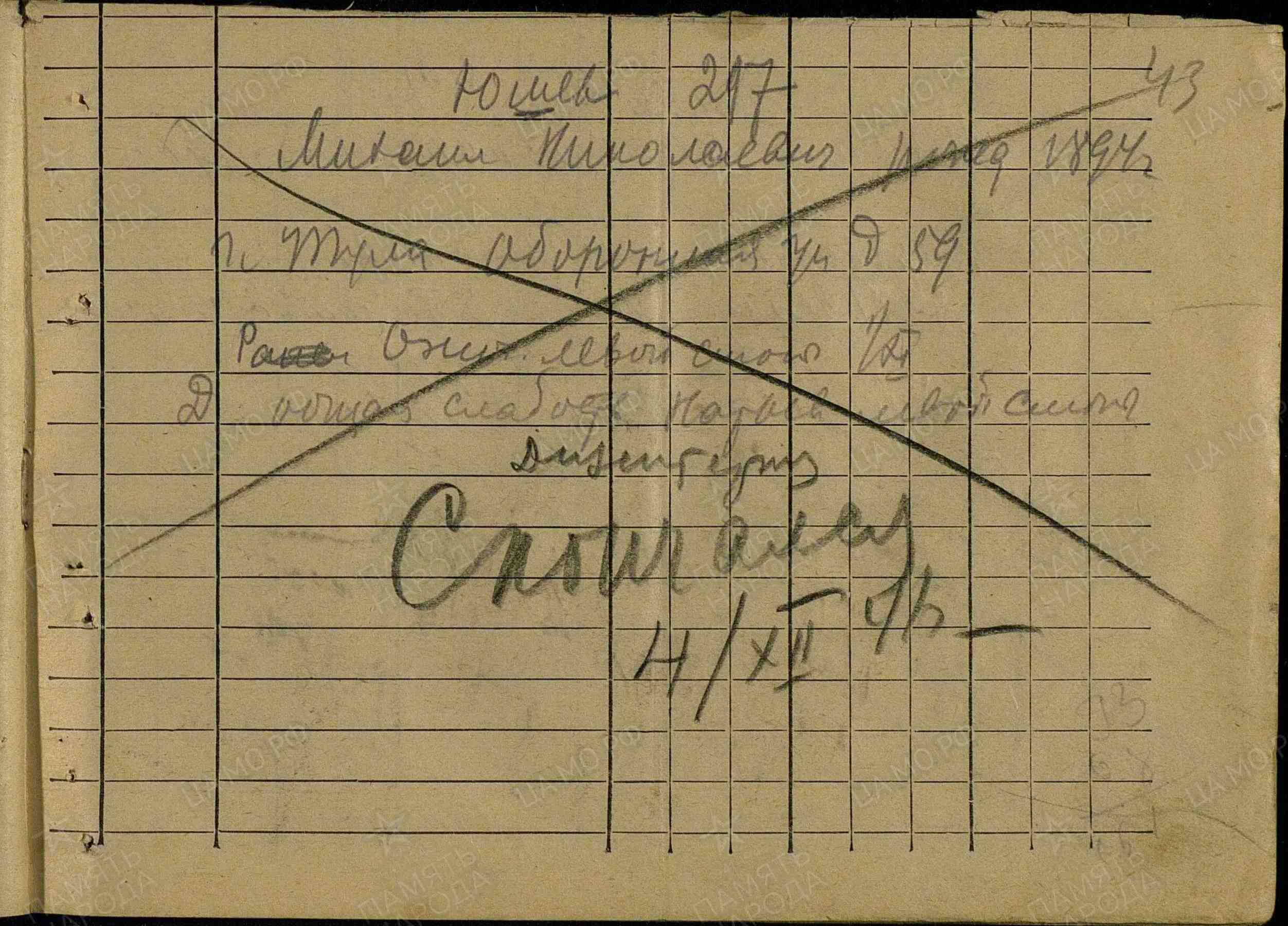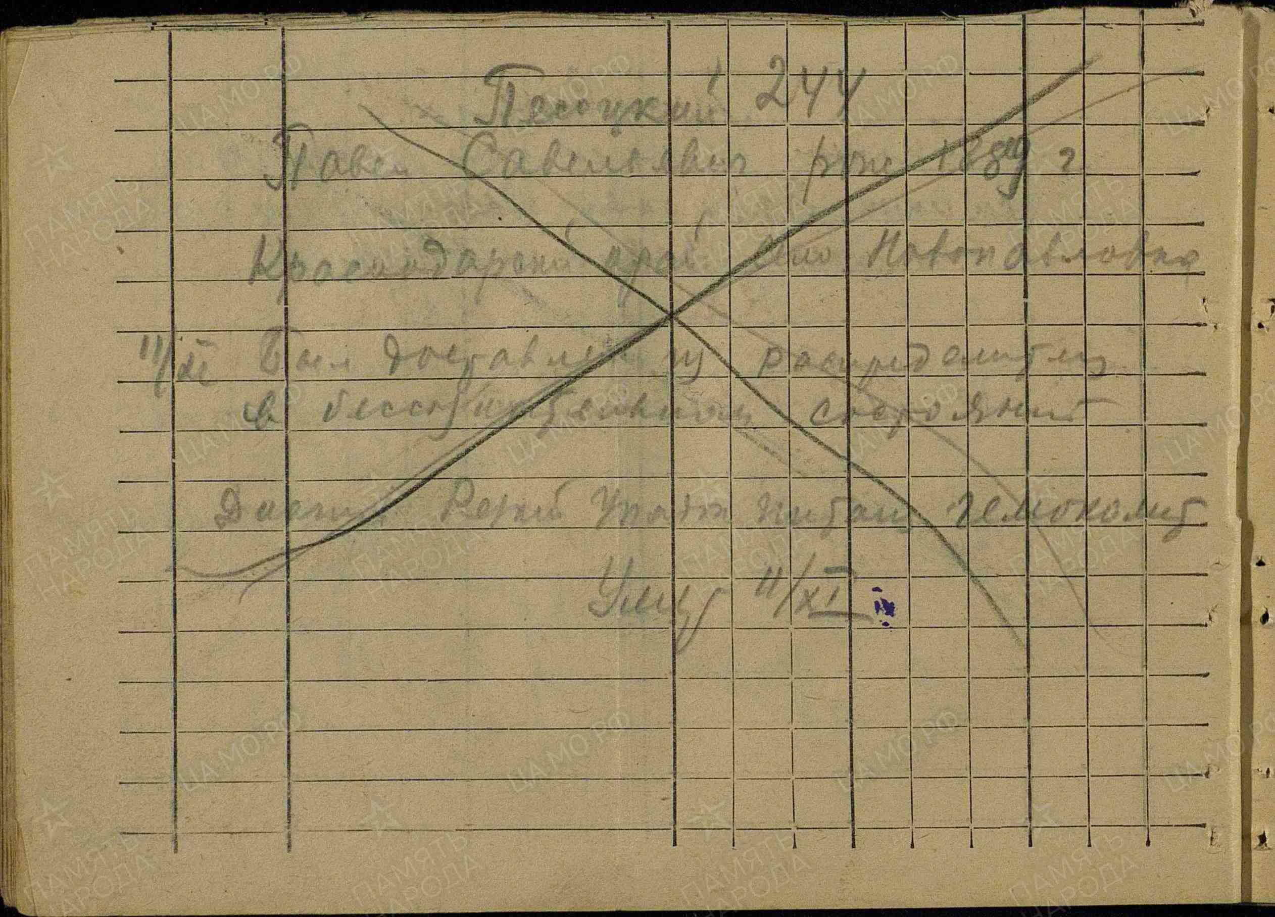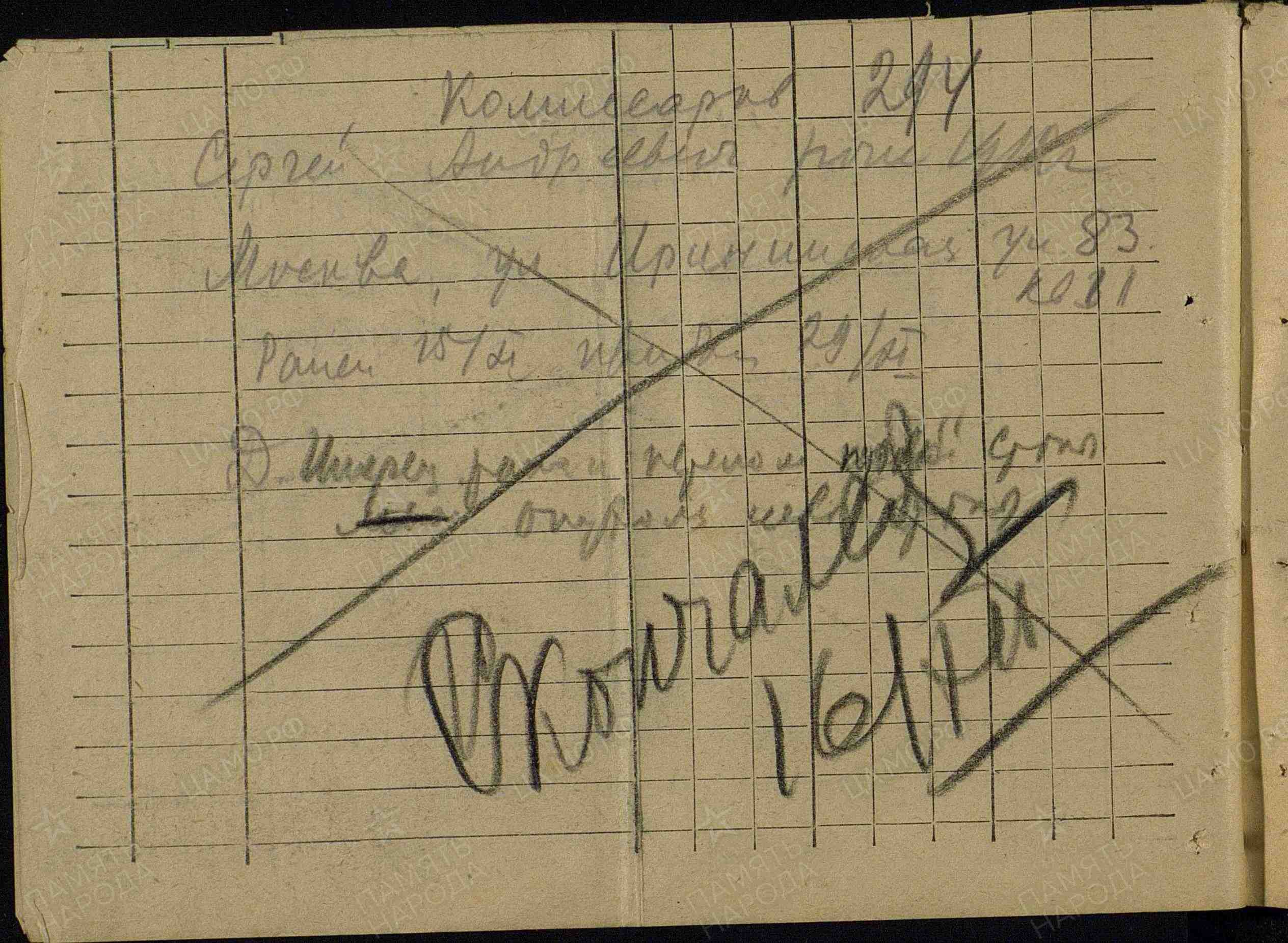 Фамилия Кириллов Имя Николай Отчество Александрович Дата рождения/Возраст __.__.1922 Место рождения Владимирская обл., Владимирский р-н, с. Доброе Дата и место призыва 11.08.1941 Владимирский РВК, Владимирская обл., Владимирский р-н Последнее место службы п/п 488 Воинское звание рядовой Причина выбытия пропал без вести Дата выбытия __.07.1942 Название источника донесения ЦАМО Номер фонда источника информации 58 Номер описи источника информации 977523 Номер дела источника информации 159 https://obd-memorial.ru/html/info.htm?id=72887908 Qui quaerit, reperit
