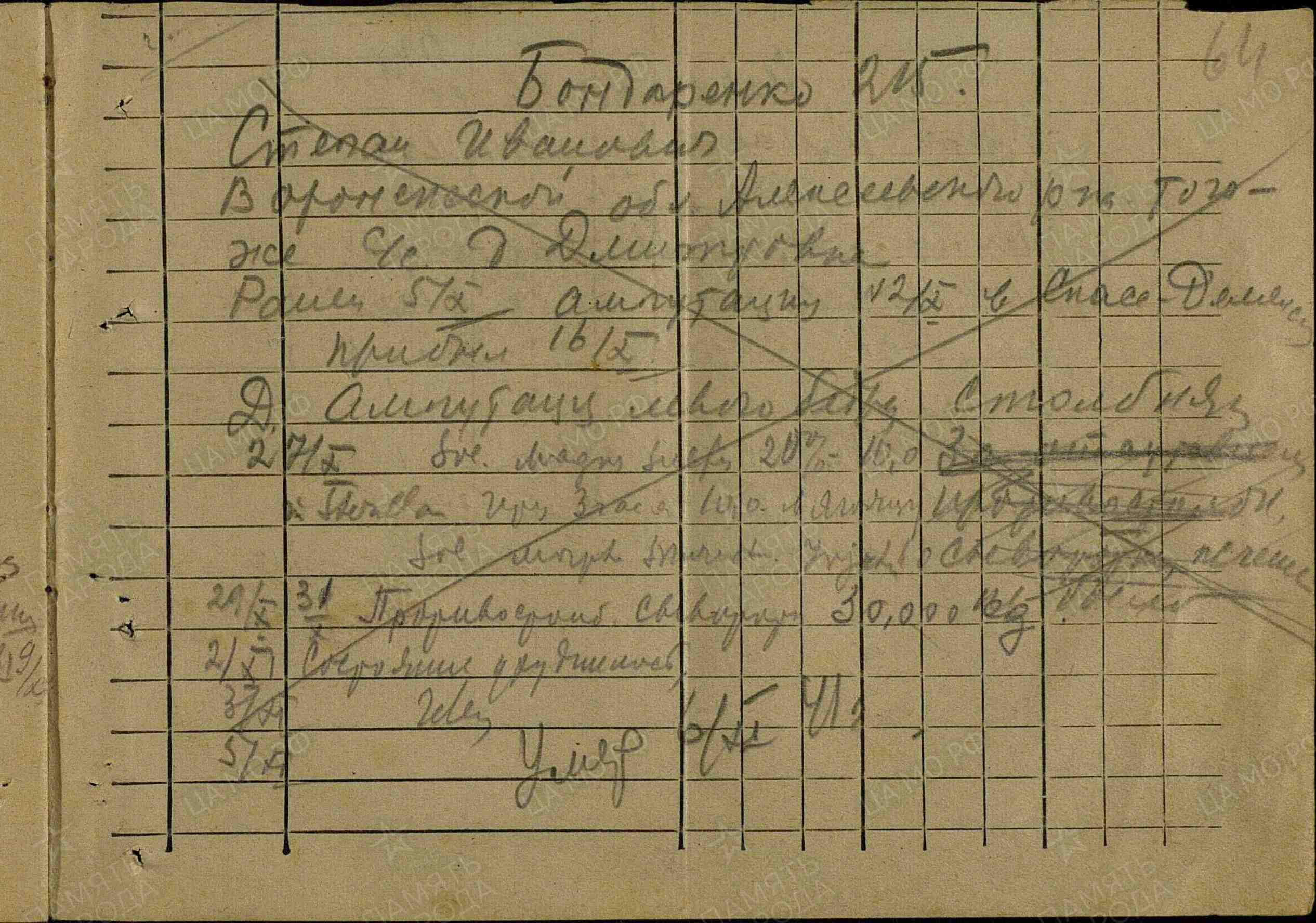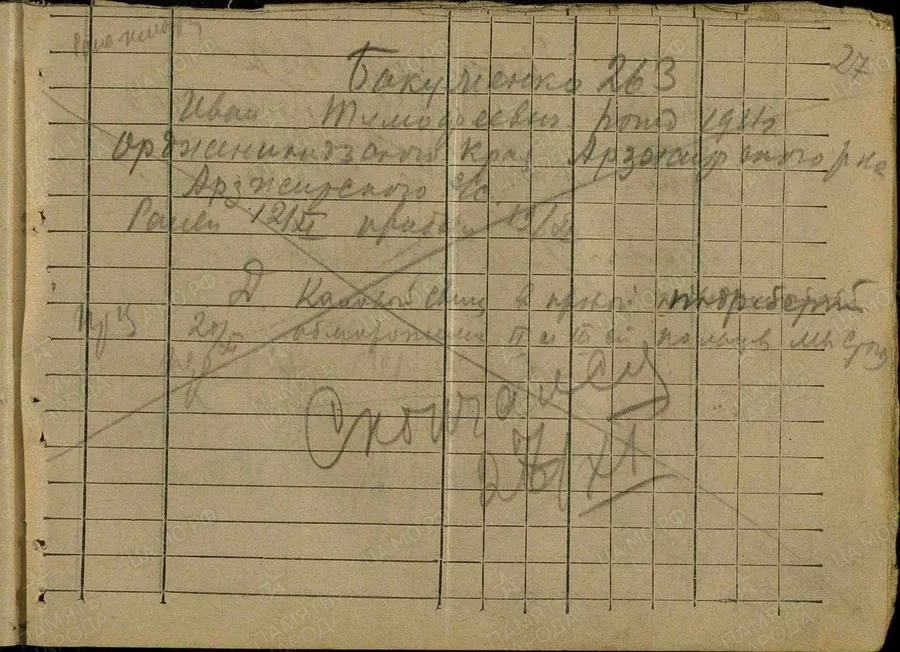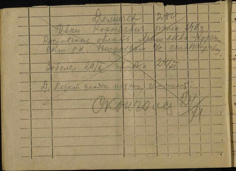 Фамилия Юрченко Имя Иван Отчество Ефимович Дата рождения/Возраст __.__.1912 Дата пленения __.__.1941 Лагерь лагерь Рославль Судьба погиб в плену Дата смерти 29.08.1941 Первичное место захоронения Смоленская обл., Рославль Название источника донесения РГВА Номер фонда источника информации 1509 Номер описи источника информации 1 Номер дела источника информации 1 https://obd-memorial.ru/html/info.htm?id=84305977