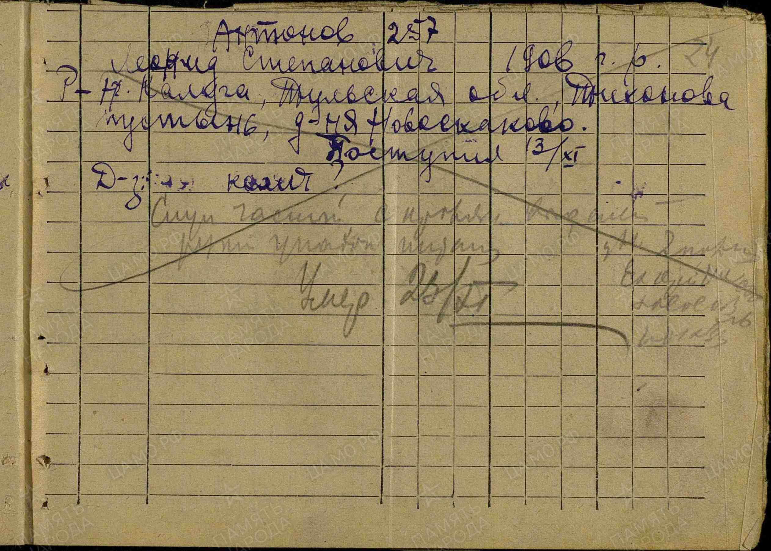 Фамилия Егоренков Имя Александр Отчество Михайлович Дата рождения/Возраст __.__.1910 Место рождения Калужская обл., Жиздринский р-н, д. Младенск Дата и место призыва __.07.1941 Жиздринский РВК, Калужская обл., Жиздринский р-н Воинское звание рядовой Место захоронения Смоленская обл., Рославльский р-н, г. Рославль Причина выбытия умер Дата выбытия __.09.1941 Первичное место захоронения Смоленская обл., Рославльский р-н, г. Рославль Название источника донесения ЦАМО Номер фонда источника информации 58 Номер описи источника информации 18004 Номер дела источника информации 188 https://obd-memorial.ru/html/info.htm?id=57085111 Qui quaerit, reperit