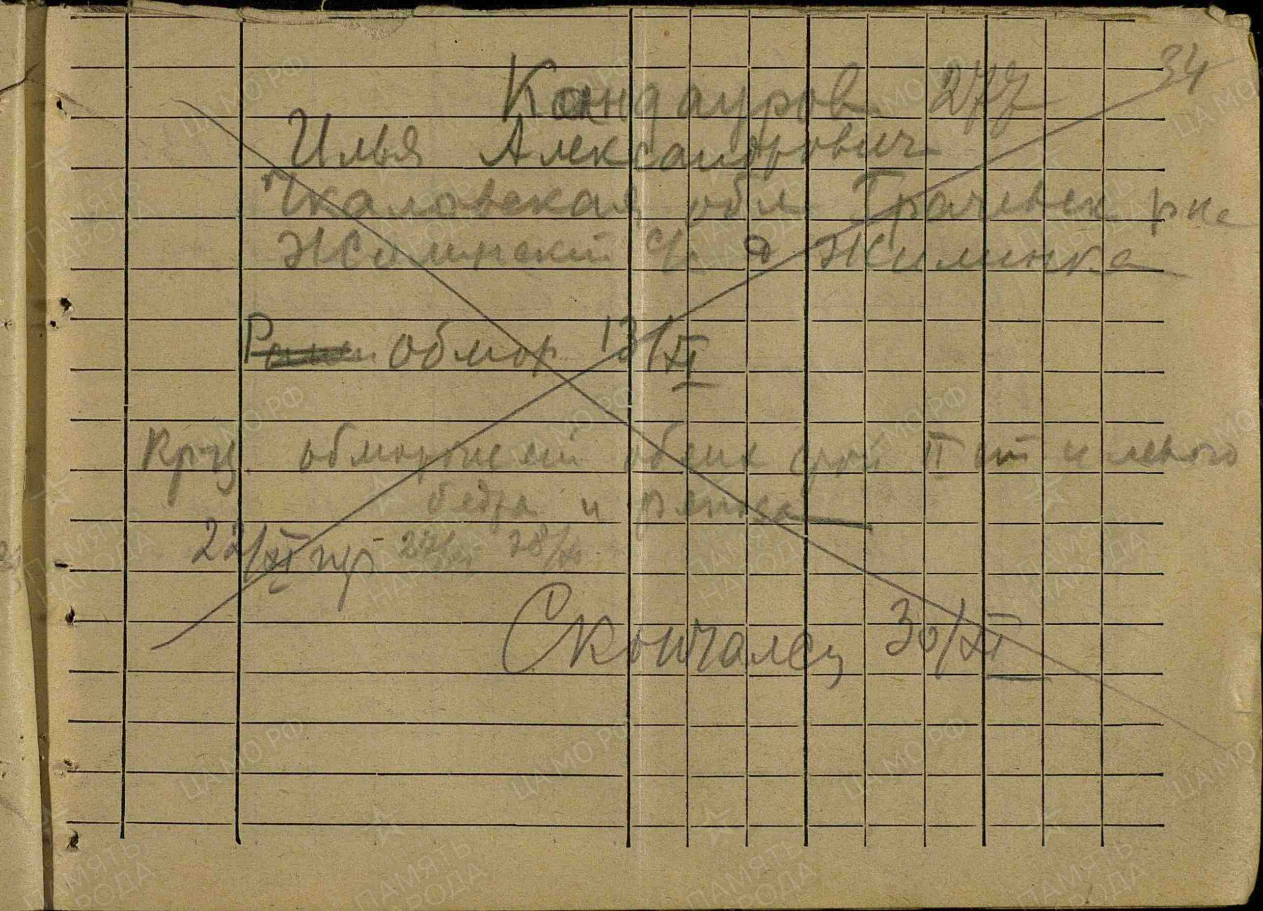 Фамилия Кандауров Имя Илья Отчество Александрович Дата пленения Не позднее 22.11.1941 Лагерь лагерь Рославль Судьба погиб в плену Воинское звание красноармеец Дата смерти 30.11.1941 Первичное место захоронения Смоленская обл., Рославль Название источника донесения РГВА Номер фонда источника информации 1509 Номер описи источника информации 1 Номер дела источника информации 2 https://obd-memorial.ru/html/info.htm?id=84306139