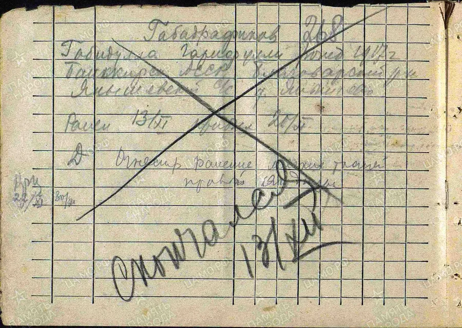 Фамилия Габадрафинов Имя Габидулла Отчество Гарифуллович Дата рождения/Возраст __.__.1917 Дата пленения Не позднее 20.11.1941 Лагерь лагерь Рославль Судьба погиб в плену Воинское звание красноармеец Дата смерти 13.12.1941 Первичное место захоронения Смоленская обл., Рославль Название источника донесения РГВА Номер фонда источника информации 1509 Номер описи источника информации 1 Номер дела источника информации 2 https://obd-memorial.ru/html/info.htm?id=84306123