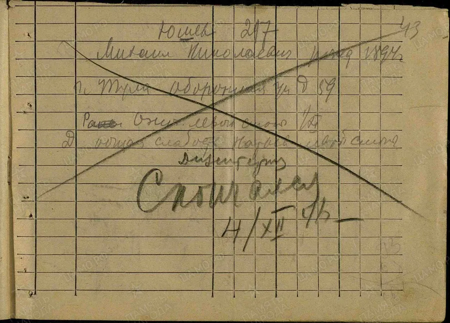 Фамилия Юшев Имя Михаил Отчество Николаевич Дата рождения/Возраст __.__.1894 Дата пленения __.__.1941 Лагерь лагерь Рославль Судьба погиб в плену Дата смерти 04.12.1941 Первичное место захоронения Смоленская обл., Рославль Название источника донесения РГВА Номер фонда источника информации 1509 Номер описи источника информации 1 Номер дела источника информации 2 https://obd-memorial.ru/html/info.htm?id=84306173