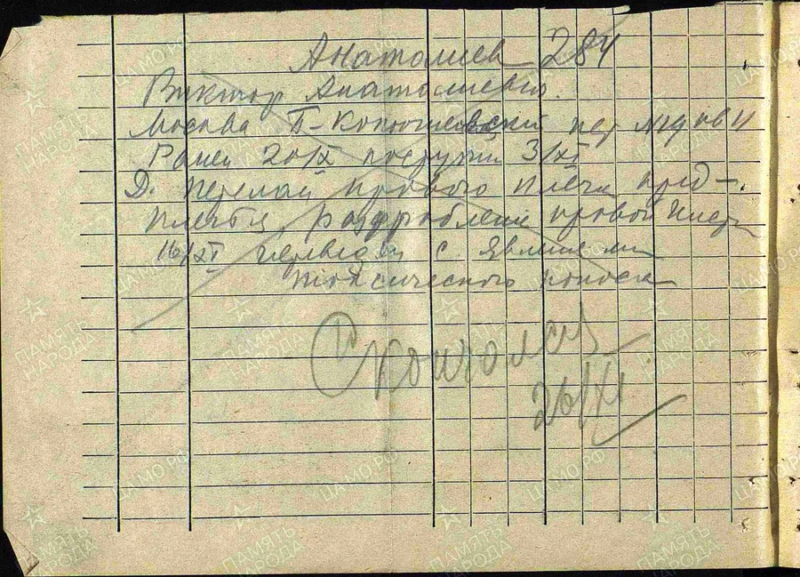Фамилия Анатольев Имя Виктор Отчество Анатольевич Место рождения Московская обл., г. Москва Последнее место службы 1291 сп Воинское звание красноармеец Причина выбытия пропал без вести Дата выбытия 20.10.1941 Название источника донесения Тверской ОВК, г. Москва Номер описи источника информации 1943 Номер дела источника информации 407 т1 https://obd-memorial.ru/html/info.htm?id=86895953