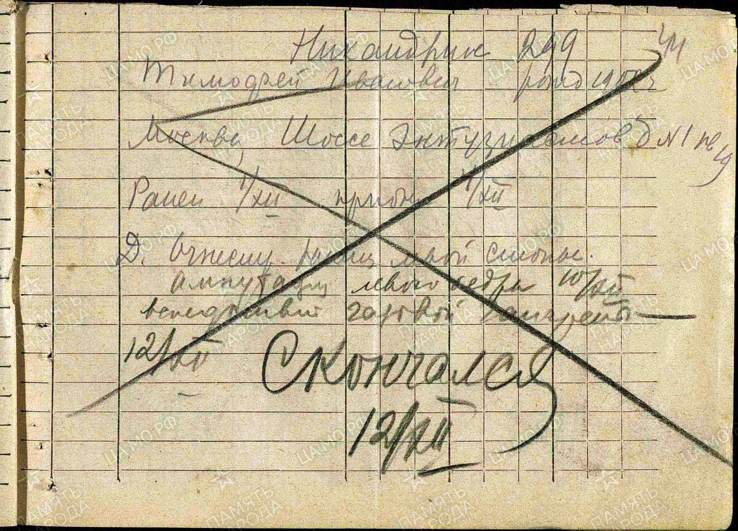 Информация из документов, уточняющих потери ID 57587441 Фамилия Никондрин Имя Тимофей Отчество Иванович Дата рождения/Возраст __.__.1902 Место рождения Тамбовская обл., Волчковский р-н, Любовка, 2 Дата и место призыва __.10.1941 неизвестный РВК, г. Москва Воинское звание красноармеец Причина выбытия пропал без вести Дата выбытия __.04.1942 Название источника донесения ЦАМО https://obd-memorial.ru/html/info.htm?id=57587441