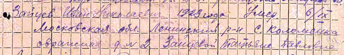 Фамилия Зайцев Имя Иван Отчество Николаевич Дата рождения/Возраст __.__.1923 Дата и место призыва __.07.1941 Ленинский РВК, Московская обл., Ленинский р-н Последнее место службы 149 сд 568 сп Воинское звание красноармеец Причина выбытия пропал без вести Дата выбытия __.10.1943 Название источника донесения ЦАМО Номер фонда источника информации 58 Номер описи источника информации 977520 Номер дела источника информации 89 https://obd-memorial.ru/html/info.htm?id=59618622