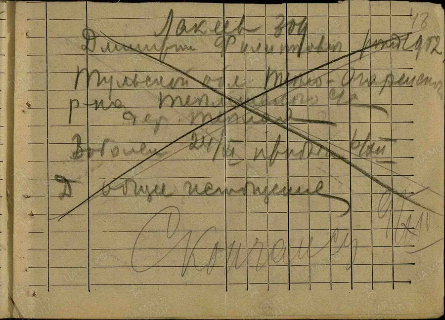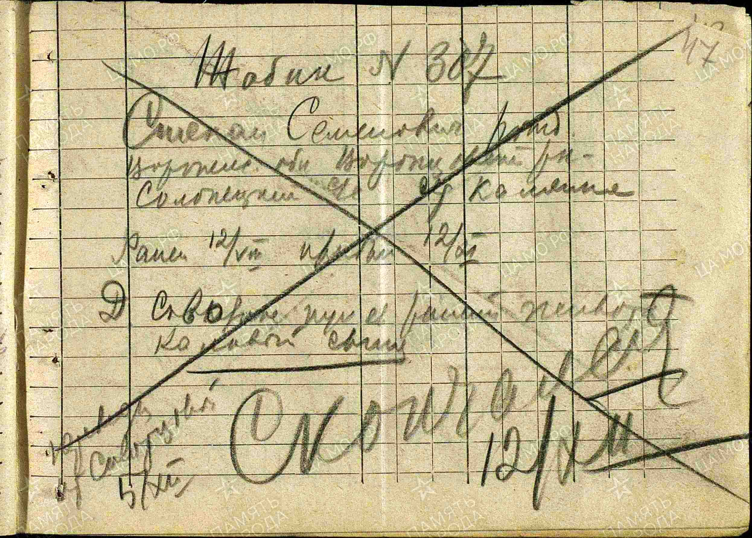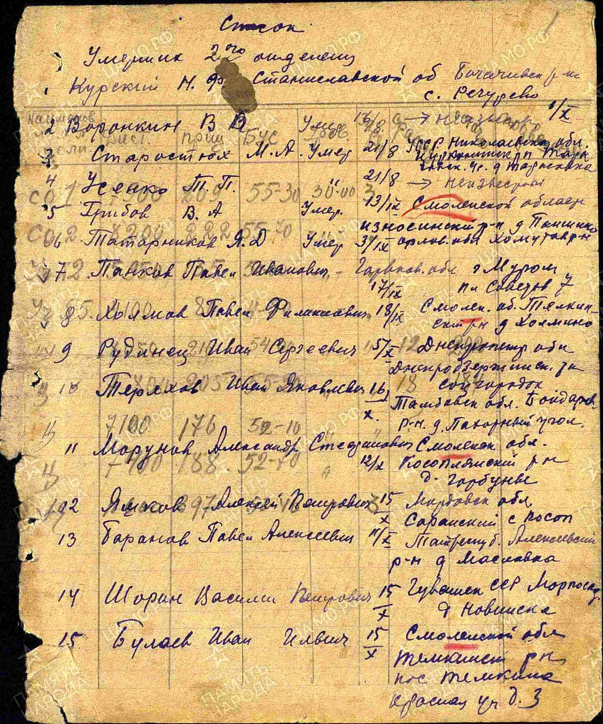 Информация из документов, уточняющих потери ID 57236007 Фамилия Бондаренко Имя Степан Отчество Иванович Дата рождения/Возраст __.__.1907 Место рождения Воронежская обл., р.п. Алексеевка, ул. Чапаева, 6 Дата и место призыва __.__.1941 Алексеевский РВК, Воронежская обл., Алексеевский р-н Воинское звание красноармеец Причина выбытия пропал без вести Дата выбытия __.03.1943 Название источника донесения ЦАМО https://obd-memorial.ru/html/info.htm?id=57236007 разведчик Ольга, Новокузнецк Молчат гробницы, мумии и кости, - Лишь слову жизнь дана: Из древней тьмы, на мировом погосте Звучат лишь письмена (И. Бунин)