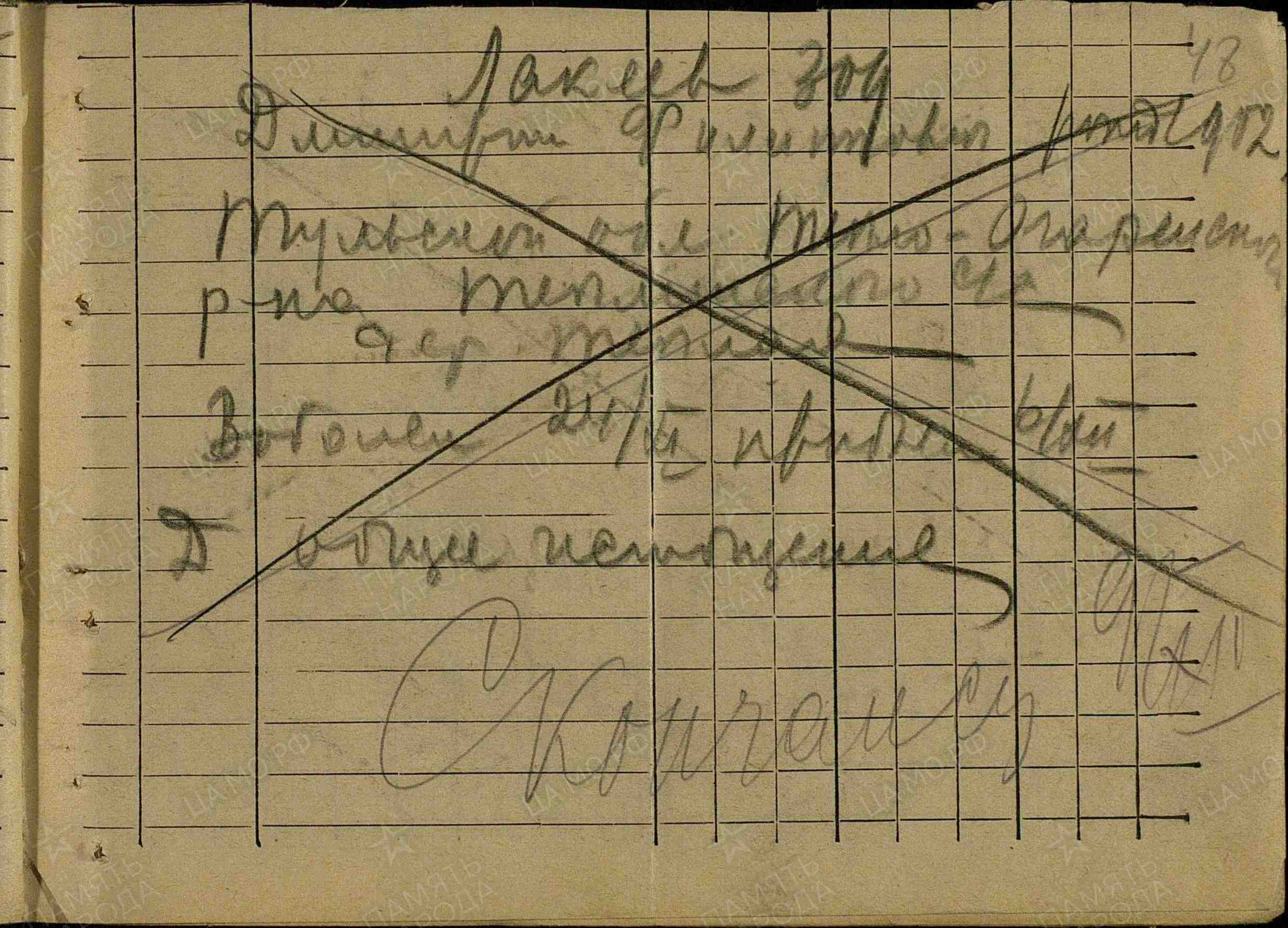 Информация из донесения о безвозвратных потерях ID 54357552 Фамилия Безперстов Имя Дмитрий Отчество Алексеевич Дата рождения/Возраст __.__.1904 Место рождения Тамбовская обл., д. Полновач Дата и место призыва Наро-Фоминский РВК, Московская обл., Наро-Фоминский р-н Последнее место службы 3 сп Воинское звание красноармеец Причина выбытия пропал без вести Дата выбытия __.11.1941 Название источника донесения ЦАМО https://obd-memorial.ru/html/info.htm?id=54357552 Ольга, Новокузнецк Молчат гробницы, мумии и кости, - Лишь слову жизнь дана: Из древней тьмы, на мировом погосте Звучат лишь письмена (И. Бунин)