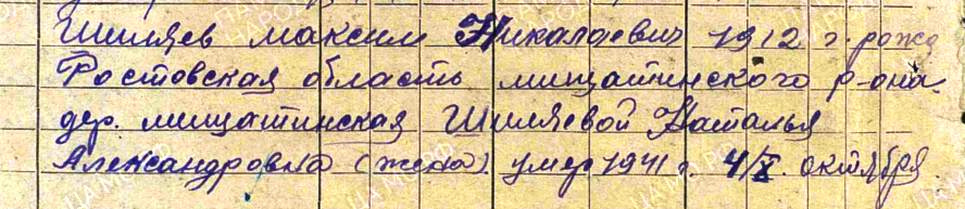 Фамилия Шиляев Имя Максим Отчество Николаевич Дата рождения/Возраст __.__.1912 Лагерь лагерь Рославль Судьба погиб в плену Дата смерти 04.10.1941 Первичное место захоронения Смоленская обл., Рославль Название источника донесения РГВА Номер фонда источника информации 1509 Номер описи источника информации 1 Номер дела источника информации 1 https://obd-memorial.ru/html/info.htm?id=84305619