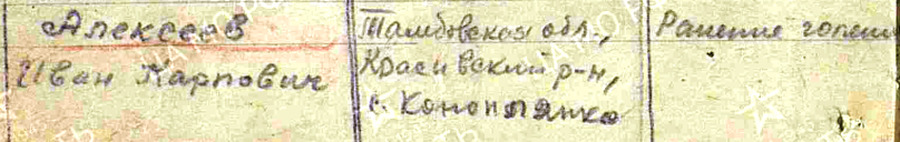Фамилия Алексеев Имя Иван Отчество Карпович Дата рождения/Возраст __.__.1903 Дата и место призыва __.__.1941 Красивский РВК, Тамбовская обл., Красивский р-н Воинское звание красноармеец Причина выбытия пропал без вести Дата выбытия __.03.1942 Название источника донесения ЦАМО Номер фонда источника информации 58 Номер описи источника информации 18004 Номер дела источника информации 341 https://obd-memorial.ru/html/info.htm?id=64745634