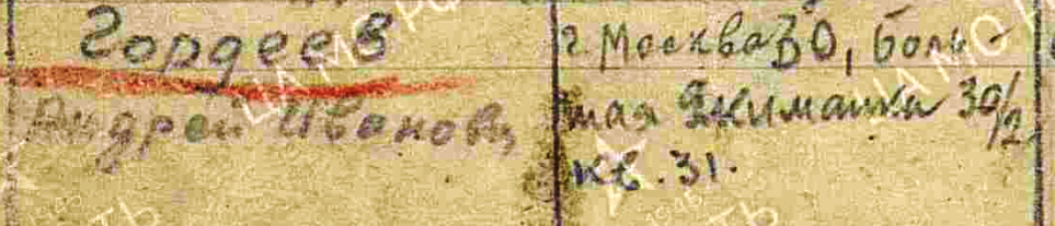 Фамилия Гордеев Имя Андрей Отчество Иванович Дата рождения/Возраст __.__.1898 Место рождения Тульская обл., с. Истленево Воинское звание красноармеец Причина выбытия пропал без вести Дата выбытия __.11.1941 Название источника донесения Гагаринский РВК, г. Москва Номер описи источника информации 1944 Номер дела источника информации 1 https://obd-memorial.ru/html/info.htm?id=87049931