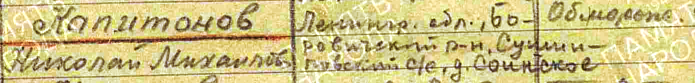 Фамилия Капитонов Имя Николай Отчество Михайлович Дата рождения/Возраст __.__.1922 Место рождения Новгородская обл., Боровичский р-н, Сушиловский с/с, д. Соинское Дата и место призыва __.__.1941 Боровичский РВК, Новгородская обл., Боровичский р-н Воинское звание красноармеец Причина выбытия пропал без вести Дата выбытия __.12.1941 Название источника донесения ЦАМО Номер фонда источника информации 58 Номер описи источника информации 18004 Номер дела источника информации 451 https://obd-memorial.ru/html/info.htm?id=58230613