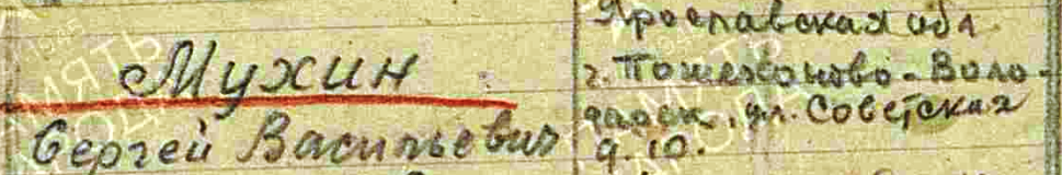 Фамилия Мухин Имя Сергей Отчество Васильевич Дата рождения/Возраст __.__.1913 Место рождения Ярославская обл., Пошехоно-Володарский р-н, д. Погорелово Дата и место призыва 23.06.1941 Пошехоно-Володарский РВК, Ярославская обл., Пошехоно-Володарский р-н Воинское звание красноармеец Причина выбытия пропал без вести Дата выбытия __.12.1941 Название источника донесения ЦАМО Номер фонда источника информации 58 Номер описи источника информации 977520 Номер дела источника информации 895 https://obd-memorial.ru/html/info.htm?id=61621861