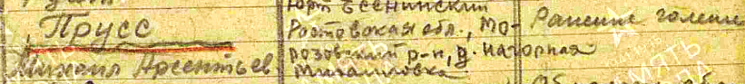 Фамилия Прусс Имя Михаил Отчество Арсентьевич Дата рождения/Возраст __.__.1903 Дата пленения Не позднее 24.10.1941 Лагерь лагерь Рославль Судьба погиб в плену Дата смерти 12.02.1942 Первичное место захоронения Смоленская обл., Рославль Название источника донесения РГВА Номер фонда источника информации 1509 Номер описи источника информации 1 Номер дела источника информации 6 https://obd-memorial.ru/html/info.htm?id=84308438