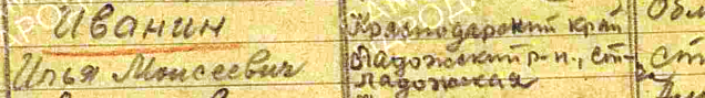 Фамилия Иванин Имя Илья Отчество Моисеевич Дата рождения/Возраст __.__.1914 Место рождения Краснодарский край, Ладожский р-н, ст-ца Ладожская Дата и место призыва Ладожский РВК, Краснодарский край, Ладожский р-н Воинское звание красноармеец Причина выбытия пропал без вести Дата выбытия __.04.1943 Название источника донесения ЦАМО Номер фонда источника информации 58 Номер описи источника информации 18004 Номер дела источника информации 677 https://obd-memorial.ru/html/info.htm?id=65916858