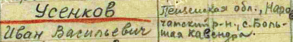 Фамилия Усенков Имя Иван Отчество Васильевич Дата пленения Не позднее 18.11.1941 Лагерь лагерь Рославль Судьба погиб в плену Дата смерти 15.01.1942 Первичное место захоронения Смоленская обл., Рославль Название источника донесения РГВА Номер фонда источника информации 1509 Номер описи источника информации 1 Номер дела источника информации 6 https://obd-memorial.ru/html/info.htm?id=84308413