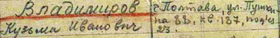 Фамилия Владимиров Имя Кузьма Отчество Иванович Дата рождения/Возраст __.__.1915 Место рождения Курская обл., г. Белгород Дата и место призыва __.07.1941 Полтавский РВК, Украинская ССР, Полтавская обл., Полтавский р-н Последнее место службы п/я 20 Воинское звание красноармеец Причина выбытия пропал без вести Дата выбытия __.12.1943 Название источника донесения ЦАМО Номер фонда источника информации 58 Номер описи источника информации 977521 Номер дела источника информации 189 https://obd-memorial.ru/html/info.htm?id=67492940
