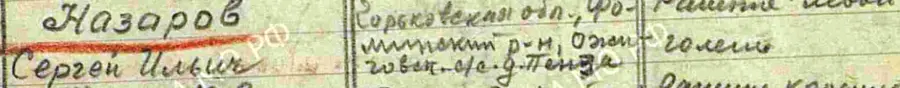 Фамилия Назаров Имя Сергей Отчество Ильич Дата рождения/Возраст __.__.1921 Дата и место призыва Фоминский РВК, Горьковская обл., Фоминский р-н Последнее место службы 43 А 18 полк Воинское звание красноармеец Причина выбытия убит Дата выбытия 04.08.1941 Первичное место захоронения Смоленская обл., Рославльский р-н, г. Рославль Название источника донесения ЦАМО Номер фонда источника информации 58 Номер описи источника информации 818884 Номер дела источника информации 33 https://obd-memorial.ru/html/info.htm?id=1038619