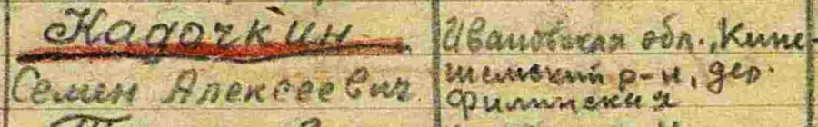 Фамилия Кадочкин Имя Семен Отчество Алексеевич Дата рождения/Возраст __.__.1910 Место рождения Ивановская обл., Кинешемский р-н, Закусихинский с/с Дата и место призыва __.__.1941 Кинешемский РВК, Ивановская обл., Кинешемский р-н Воинское звание красноармеец Причина выбытия пропал без вести Дата выбытия __.12.1941 Название источника донесения ЦАМО Номер фонда источника информации 58 Номер описи источника информации 18004 Номер дела источника информации 480 https://obd-memorial.ru/html/info.htm?id=58232069