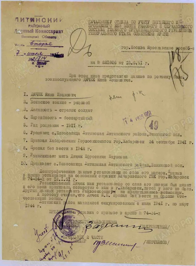 Информация из документов, уточняющих потери ID 70054562 Фамилия Дячек Имя Яков Отчество Иванович Дата рождения/Возраст __.__.1911 Место рождения Украинская ССР, Винницкая обл., Литинский р-н, с. Новоселица Литинская Дата и место призыва 24.09.1941 Хабаровский ГВК, Хабаровский край, г. Хабаровск Воинское звание рядовой Причина выбытия пропал без вести Дата выбытия __.07.1944 Название источника донесения ЦАМО https://obd-memorial.ru/html/info.htm?id=70054562