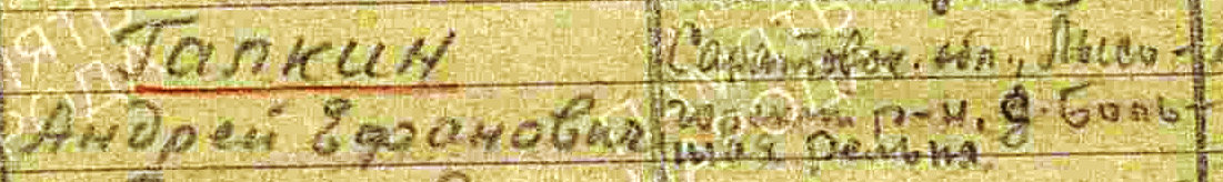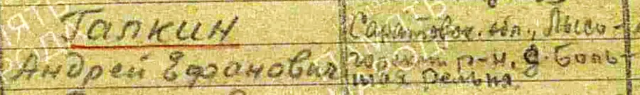 Фамилия Галкин Имя Андрей Отчество Ефанович Дата рождения/Возраст __.__.1910 Место рождения Саратовская обл., Лысогорский р-н, с. Большая Рельня Дата и место призыва __.07.1941 Дурасовский РВК, Саратовская обл., Дурасовский р-н Воинское звание красноармеец Причина выбытия пропал без вести Дата выбытия __.01.1942 Название источника донесения ЦАМО Номер фонда источника информации 58 Номер описи источника информации 977520 Номер дела источника информации 186 https://obd-memorial.ru/html/info.htm?id=65022735