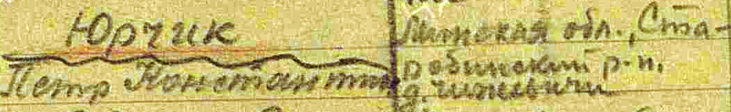 Фамилия Юрчик Имя Петр Отчество Константинович Дата рождения/Возраст __.__.1919 Место рождения Белорусская ССР, Бобруйская обл., Старобинский р-н, д. Кулаки Дата и место призыва __.__.1940 Старобинский РВК, Белорусская ССР, Минская обл., Старобинский р-н Воинское звание рядовой Причина выбытия пропал без вести Дата выбытия __.09.1944 Название источника донесения ЦАМО Номер фонда источника информации 58 Номер описи источника информации 18004 Номер дела источника информации 576 https://obd-memorial.ru/html/info.htm?id=58245008