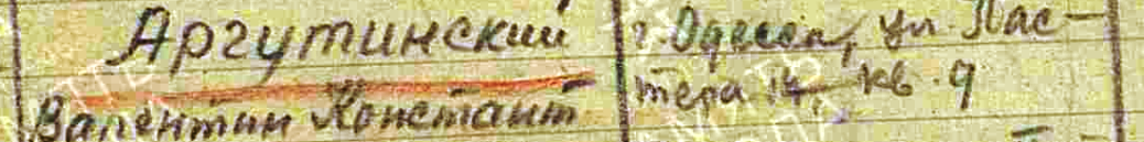 Фамилия Аргутинский Имя Валентин Отчество Константинович Дата рождения/Возраст __.__.1919 Дата пленения Не позднее 10.10.1941 Лагерь лагерь Рославль Судьба погиб в плену Дата смерти 24.01.1942 Первичное место захоронения Смоленская обл., Рославль Название источника донесения РГВА Номер фонда источника информации 1509 Номер описи источника информации 1 Номер дела источника информации 6 https://obd-memorial.ru/html/info.htm?id=84308501