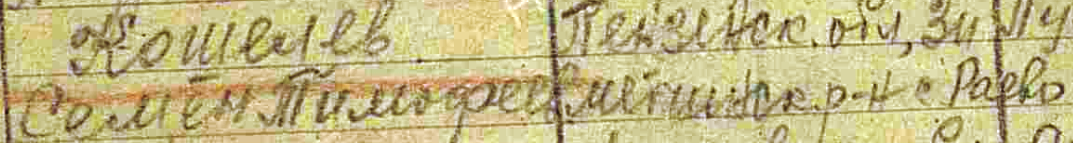 Фамилия Кошелев Имя Семен Отчество Тимофеевич Дата рождения/Возраст __.__.1908 Место рождения Пензенская обл., Земетчинский р-н, с. Раево Дата и место призыва __.__.1941 Земетчинский РВК, Пензенская обл., Земетчинский р-н Воинское звание красноармеец Причина выбытия пропал без вести Дата выбытия __.12.1942 Название источника донесения ЦАМО Номер фонда источника информации 58 Номер описи источника информации 18004 Номер дела источника информации 599 https://obd-memorial.ru/html/info.htm?id=58665442