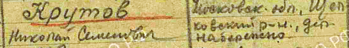 Фамилия Крутов Имя Николай Отчество Семенович Дата рождения/Возраст __.__.1924 Дата пленения Не позднее 16.10.1941 Лагерь лагерь Рославль Судьба погиб в плену Дата смерти 14.01.1942 Первичное место захоронения Смоленская обл., Рославль Название источника донесения РГВА Номер фонда источника информации 1509 Номер описи источника информации 1 Номер дела источника информации 6 https://obd-memorial.ru/html/info.htm?id=57200134