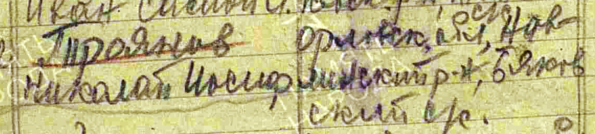 Фамилия Троянов Имя Николай Отчество Иосифович Дата рождения/Возраст __.__.1921 Дата пленения Не позднее 01.09.1941 Лагерь лагерь Рославль Судьба погиб в плену Дата смерти 26.01.1942 Первичное место захоронения Смоленская обл., Рославль Название источника донесения РГВА Номер фонда источника информации 1509 Номер описи источника информации 1 Номер дела источника информации 6 https://obd-memorial.ru/html/info.htm?id=84308517