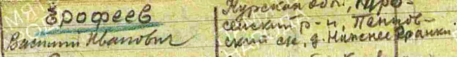 Фамилия Ерофеев Имя Василий Отчество Иванович Дата рождения/Возраст __.__.1914 Место рождения Курская обл., Троснянский р-н, Пеновский с/с, д. Нижнегранкино Последнее место службы ппс 41 Воинское звание красноармеец Причина выбытия пропал без вести Дата выбытия __.10.1941 Название источника донесения ЦАМО Номер фонда источника информации 58 Номер описи источника информации 18001 Номер дела источника информации 953 https://obd-memorial.ru/html/info.htm?id=55258760