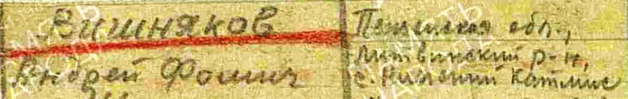 Фамилия Вишняков Имя Андрей Отчество Фомич Дата рождения/Возраст __.__.1914 Дата пленения Не позднее 13.11.1941 Лагерь лагерь Рославль Судьба погиб в плену Дата смерти 02.02.1942 Первичное место захоронения Смоленская обл., Рославль Название источника донесения РГВА Номер фонда источника информации 1509 Номер описи источника информации 1 Номер дела источника информации 6 https://obd-memorial.ru/html/info.htm?id=84308447