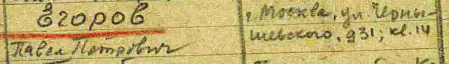 Фамилия Егоров Имя Павел Отчество Петрович Дата рождения/Возраст __.__.1894 Место рождения г. Москва Дата и место призыва Куйбышевский РВК, Московская обл., г. Москва, Куйбышевский р-н Последнее место службы 110 сд Воинское звание красноармеец Причина выбытия пропал без вести Дата выбытия 20.10.1941 Место выбытия Московская обл., Боровский р-н, д. Мишуково, в районе Название источника донесения ЦАМО Номер фонда источника информации 58 Номер описи источника информации 818883 Номер дела источника информации 232 https://obd-memorial.ru/html/info.htm?id=1553950