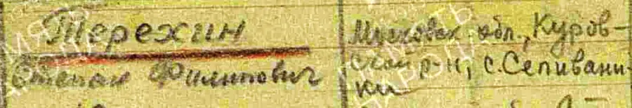 Фамилия Терехин Имя Степан Отчество Филиппович Дата рождения/Возраст __.__.1897 Место рождения Московская обл., Куровской р-н, д. Селиваниха Дата и место призыва 18.09.1941 Куровской РВК, Московская обл., Куровской р-н Последнее место службы 457 полк Воинское звание красноармеец Причина выбытия пропал без вести Дата выбытия __.03.1942 Название источника донесения ЦАМО Номер фонда источника информации 58 Номер описи источника информации 18004 Номер дела источника информации 358 https://obd-memorial.ru/html/info.htm?id=57734945
