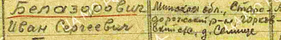 Фамилия Белазорович Имя Иван Отчество Сергеевич Дата пленения Не позднее 13.08.1941 Лагерь лагерь Рославль Судьба погиб в плену Дата смерти 02.03.1942 Первичное место захоронения Смоленская обл., Рославль Название источника донесения РГВА Номер фонда источника информации 1509 Номер описи источника информации 1 Номер дела источника информации 6 https://obd-memorial.ru/html/info.htm?id=84308450