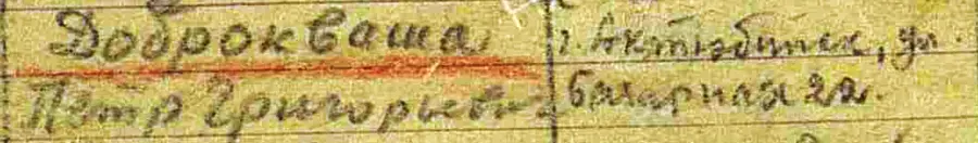 Фамилия Доброквашин Имя Петр Отчество Григорьевич Дата рождения/Возраст __.__.1909 Место рождения Казахская ССР, Актюбинская обл., г. Актюбинск Дата и место призыва 15.06.1941 Актюбинский ГВК, Казахская ССР, Актюбинская обл., г. Актюбинск Последнее место службы п/п 010 Воинское звание красноармеец Причина выбытия пропал без вести Дата выбытия __.02.1942 Название источника донесения ЦАМО Номер фонда источника информации 58 Номер описи источника информации 18004 Номер дела источника информации 528 https://obd-memorial.ru/html/info.htm?id=58446825
