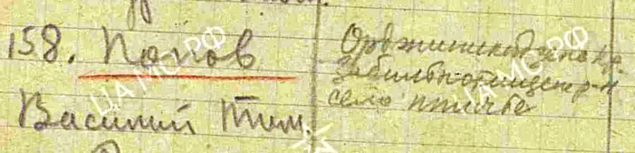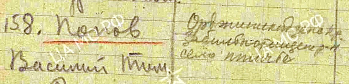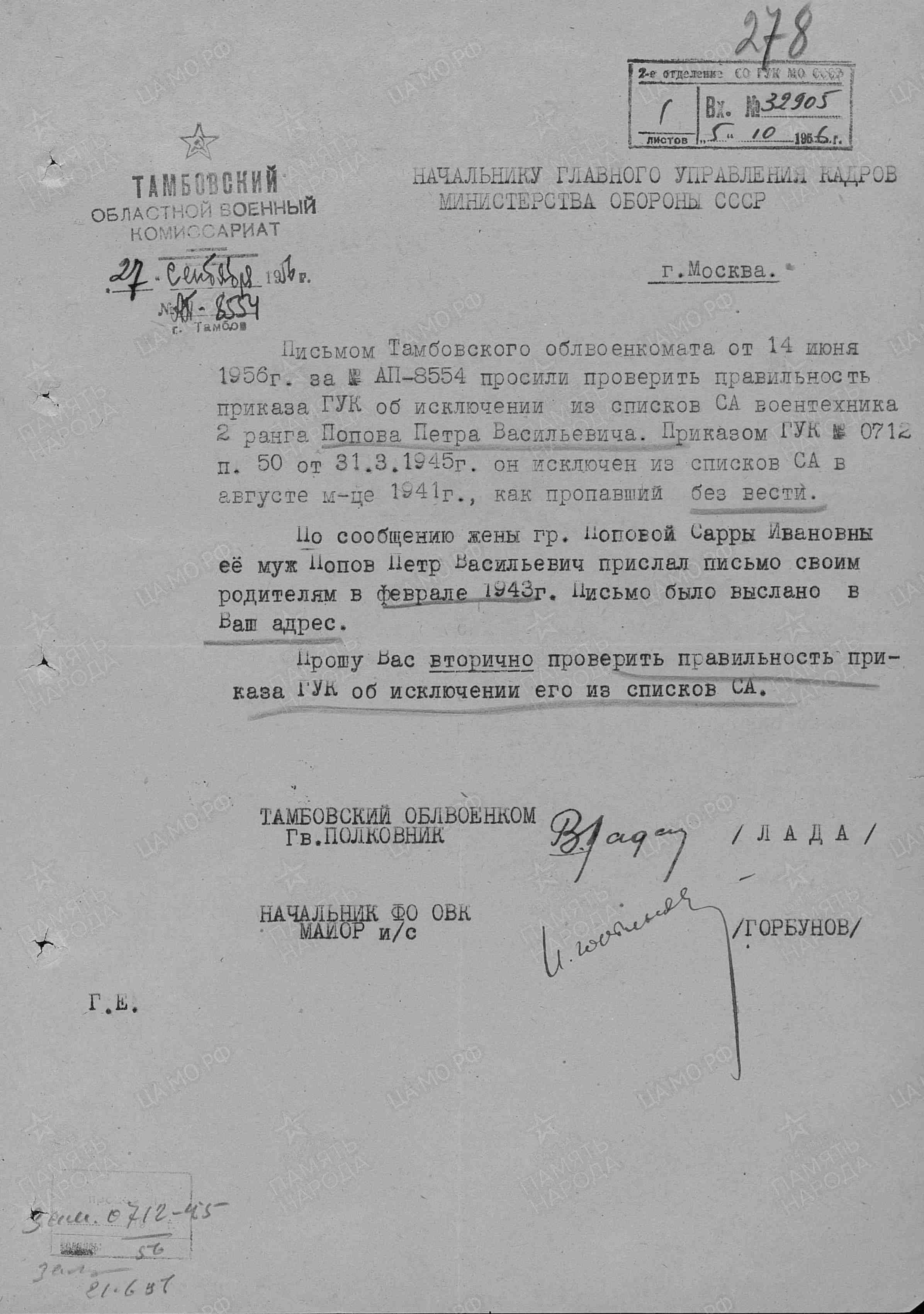 Попов Пётр Васильевич Дата рождения 16.09.1910 Место рождения Тамбовская обл., Бондарский р-н, с. Черновка Воинская часть 498 стрелковый полк Причина выбытия Пропал без вести Дата поступления на службу 14.12.1933 Воинское звание воентехник 2 ранга Дата окончания службы __.02.1943 https://m.pamyat-naroda.ru/heroes....&page=1