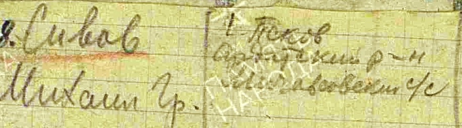 Информация из документов, уточняющих потери ID 60769371 Фамилия Грибов Имя Василий Отчество Петрович Дата рождения/Возраст __.__.1910 Место рождения Калужская обл., Износковский р-н, д. Паньшино Дата и место призыва 25.06.1941 Износковский РВК, Калужская обл., Износковский р-н Воинское звание красноармеец Причина выбытия пропал без вести Дата выбытия __.02.1942 Название источника донесения ЦАМО https://obd-memorial.ru/html/info.htm?id=60769371 Ольга, Новокузнецк Молчат гробницы, мумии и кости, - Лишь слову жизнь дана: Из древней тьмы, на мировом погосте Звучат лишь письмена (И. Бунин)