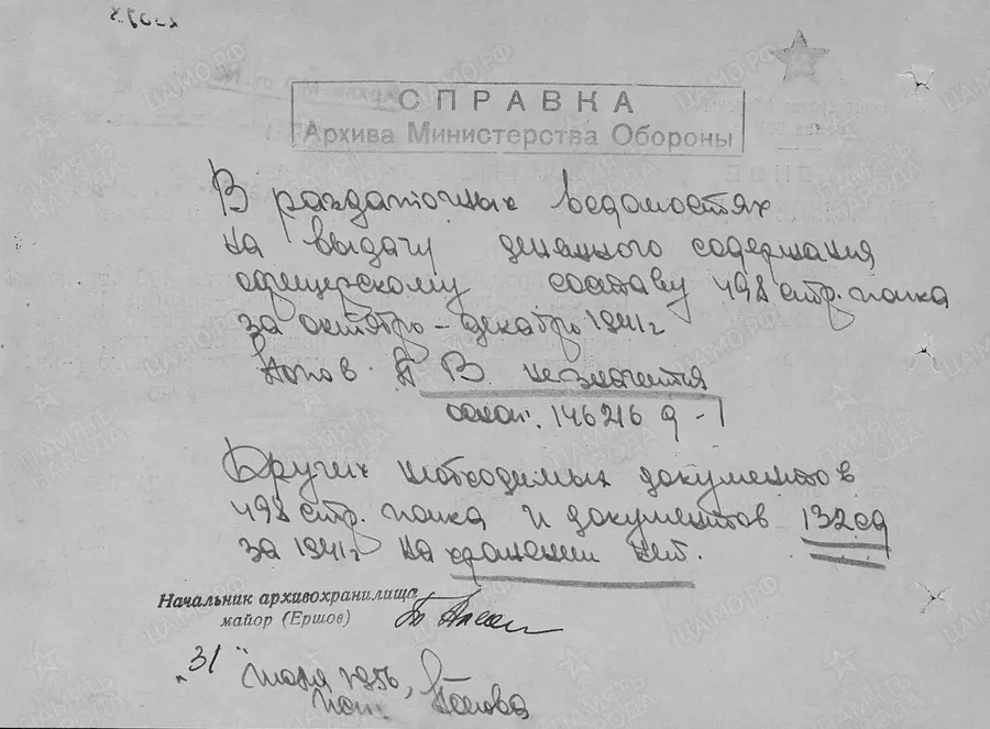 Информация из документов, уточняющих потери ID 61455181 Фамилия Ширяев Имя Максим Отчество Николаевич Дата рождения/Возраст __.__.1912 Место рождения Ростовская обл., Мечетинский р-н, Россошинский с/с Дата и место призыва __.__.1941 Мечетинский РВК, Ростовская обл., Мечетинский р-н Воинское звание красноармеец Причина выбытия пропал без вести Дата выбытия __.04.1943 Название источника донесения ЦАМО https://obd-memorial.ru/html/info.htm?id=61455181 Письмо из брянских лесов Ольга, Новокузнецк Молчат гробницы, мумии и кости, - Лишь слову жизнь дана: Из древней тьмы, на мировом погосте Звучат лишь письмена (И. Бунин)