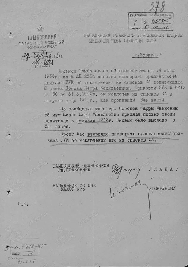 Информация из документов, уточняющих потери ID 76098512 Фамилия Попов Имя Петр Отчество Васильевич Место рождения Тамбовская обл., Бондарский р-н, с. Черновки Воинское звание воентехник Причина выбытия пропал без вести Дата выбытия __.08.1941 Название источника донесения ЦАМО https://obd-memorial.ru/html/info.htm?id=76098512