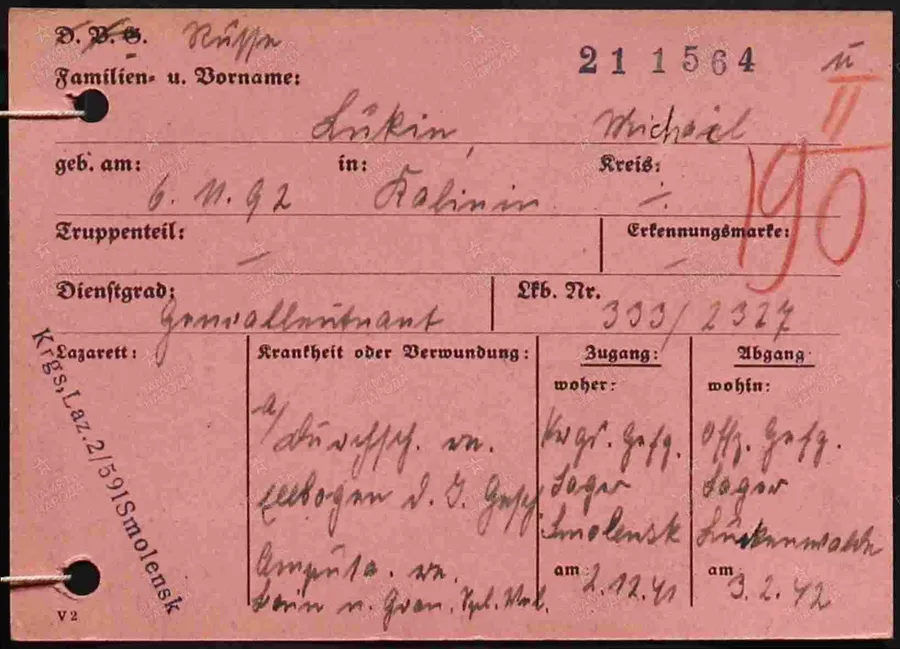 | Цитата MSDNO_17 (  ) Как видите, генерал Лукин ошибся лишь на сутки: лазаретная карта дату поступления в немецкий госпиталь обозначает как 2 декабря 1941 г. А вот дата выписки и перевода из Смоленска в Луккенвальде указана верно: 3 февраля 1942 года: